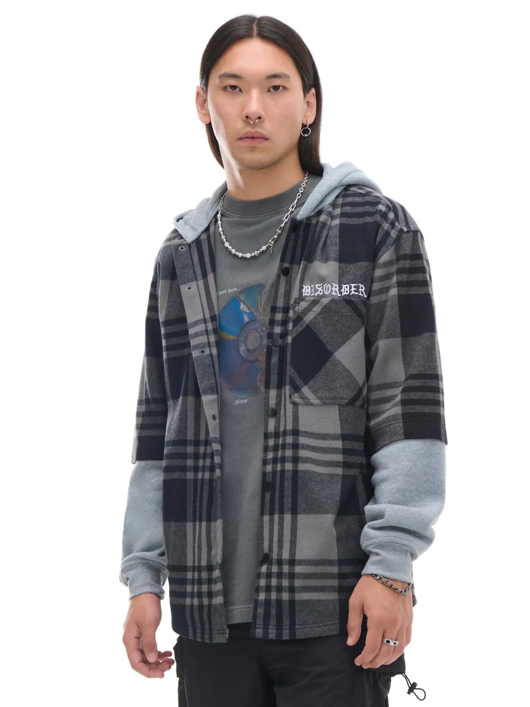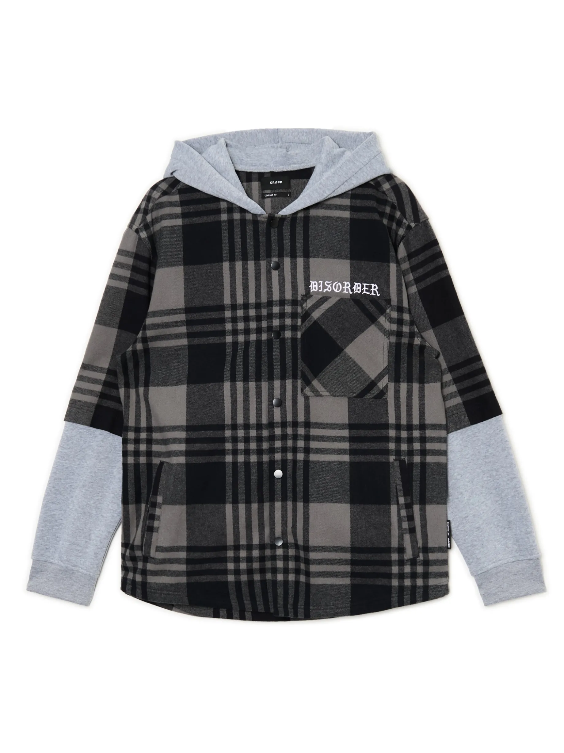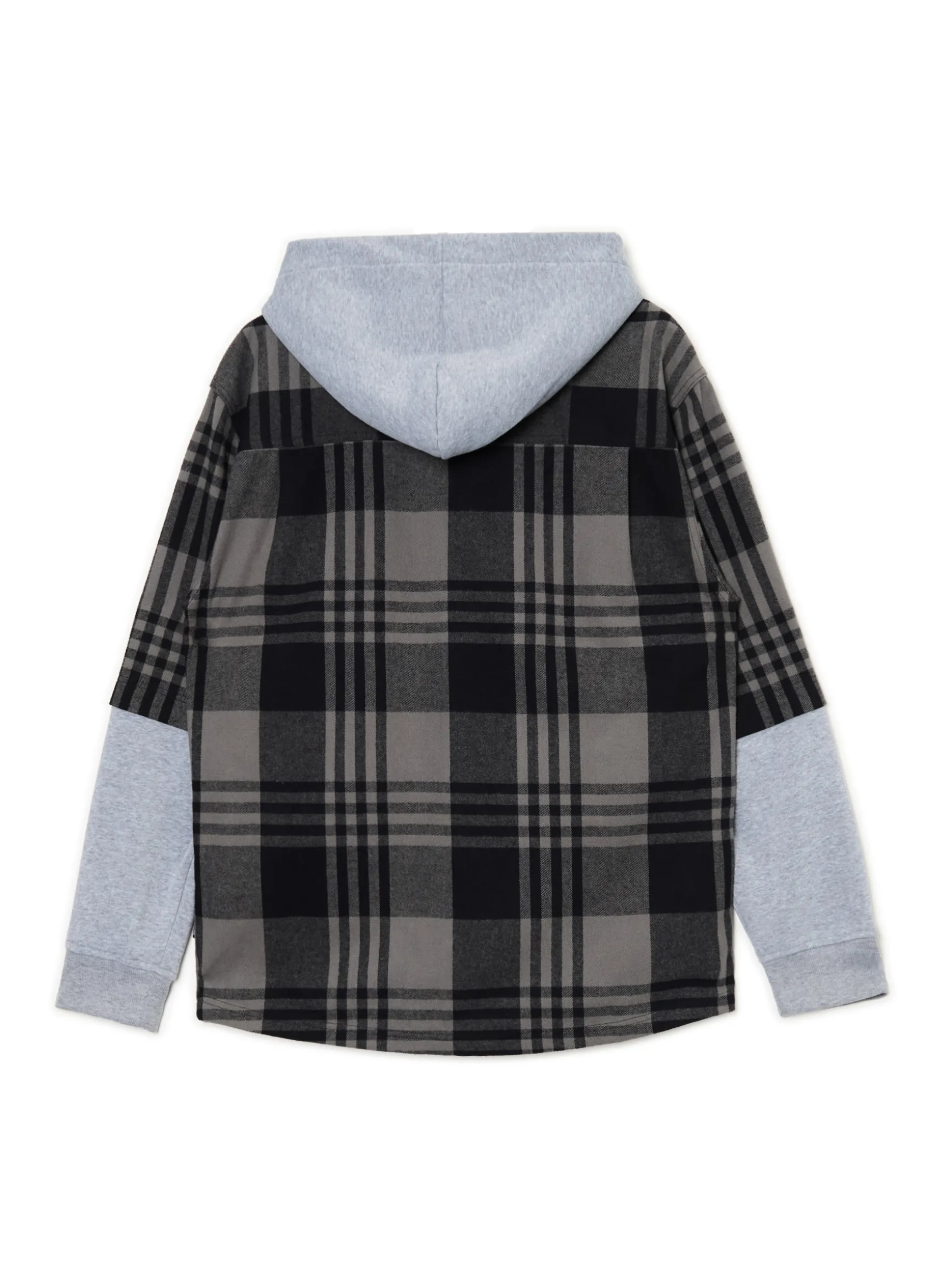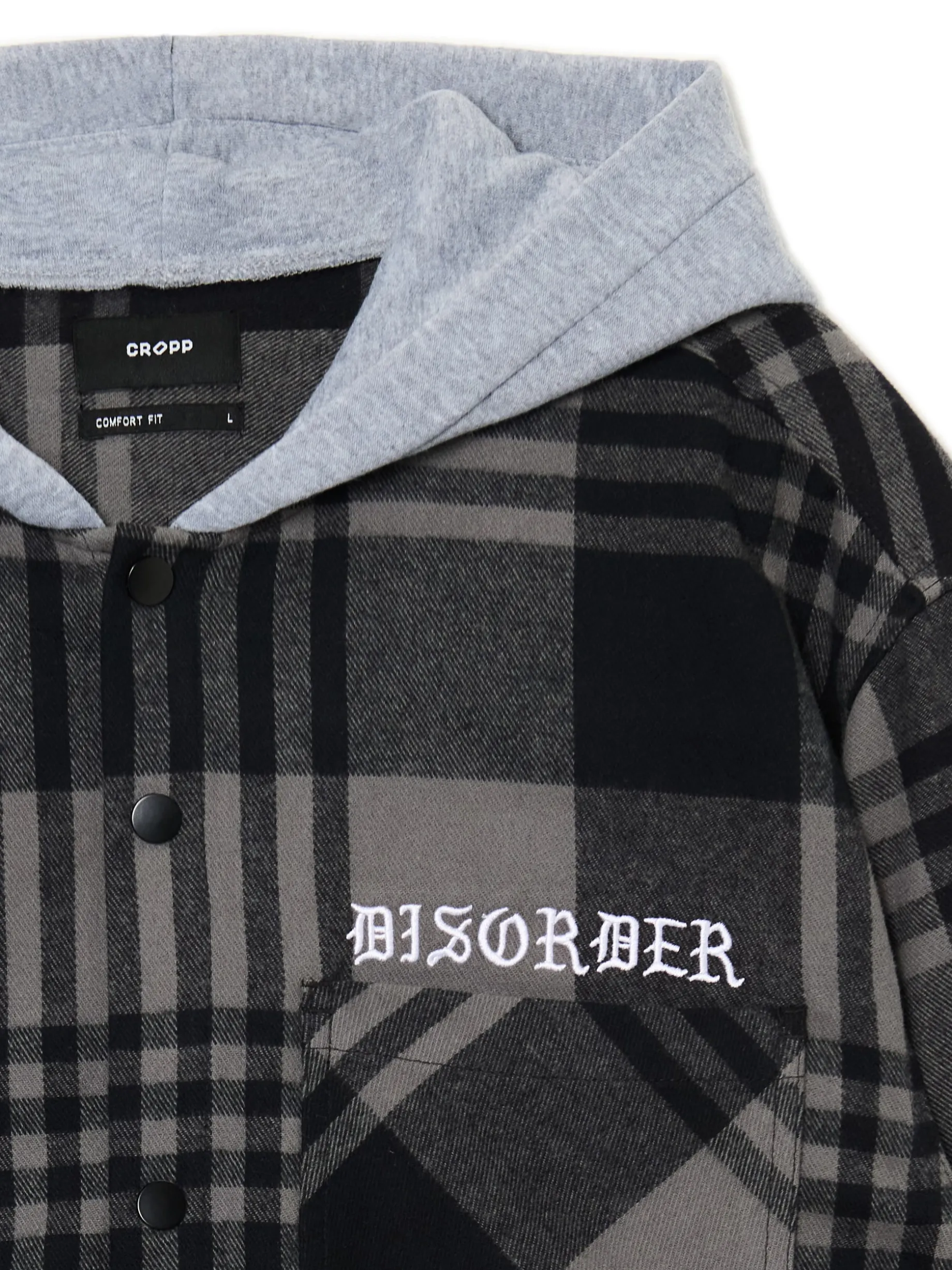 Męska koszula uszyta z grubszej tkaniny z rękawami i kapturem charakterystycznymi dla bluz typu hoodie. Look & vibe! uszyta z tkaniny z dodatkiem wiskozy swobodny, luźny krój praktyczne zapięcie na zatrzaski obszerny kaptur długie rękawy wykończone ściągaczami skośne kieszenie po bokach naszywana kieszeń na piersi ozdobne wstawki niewielki haft z przodu wzór w kratę