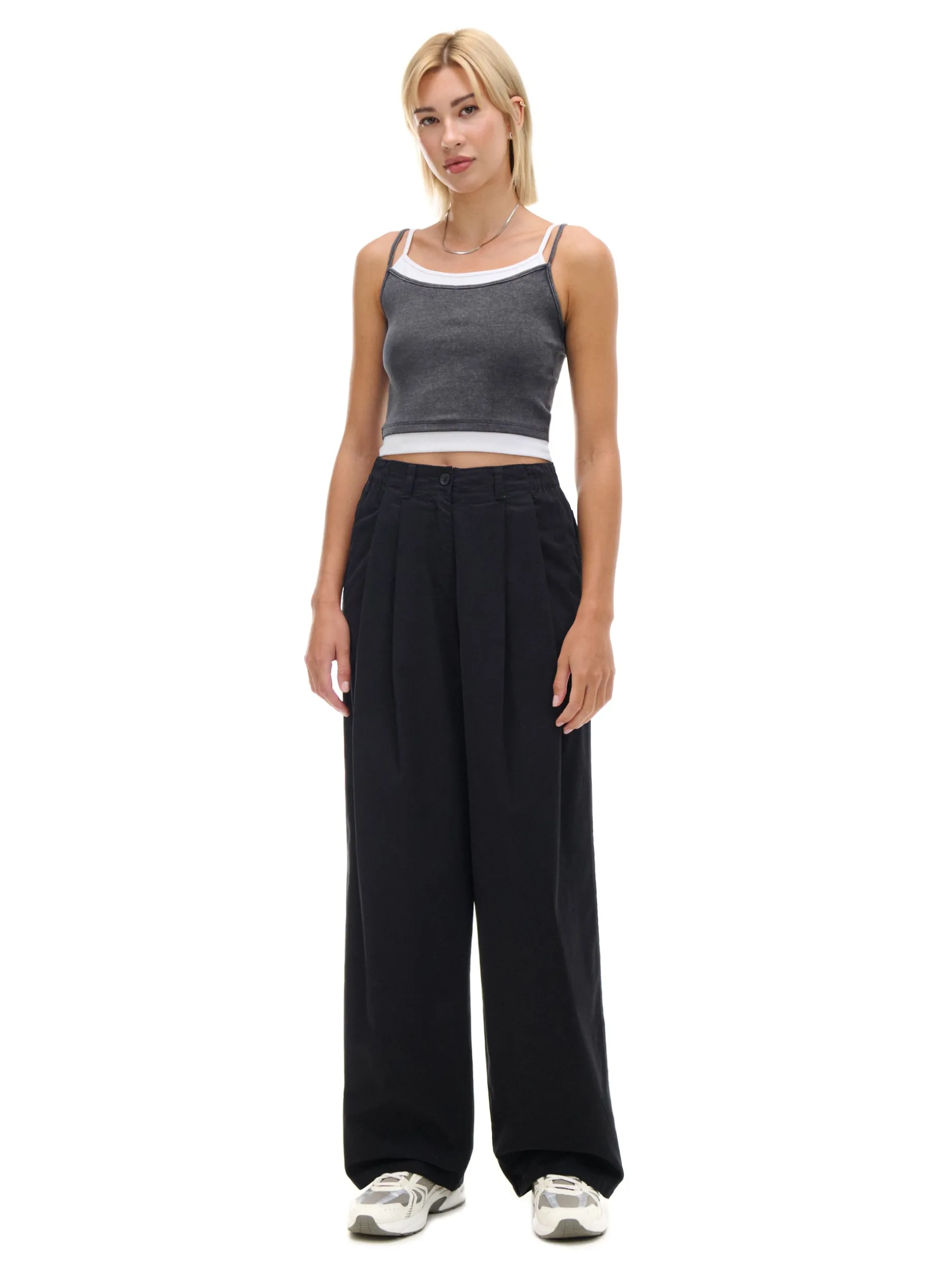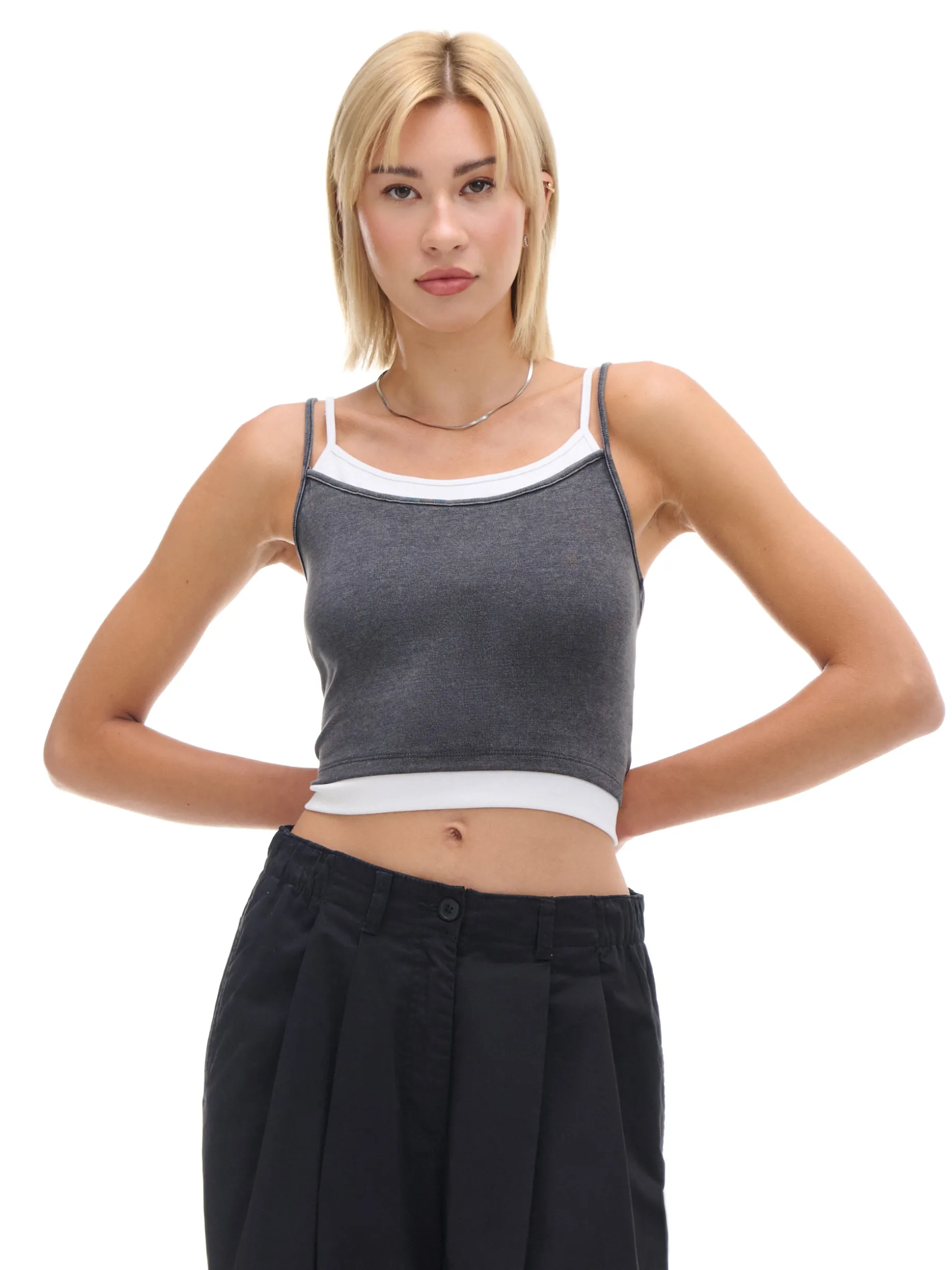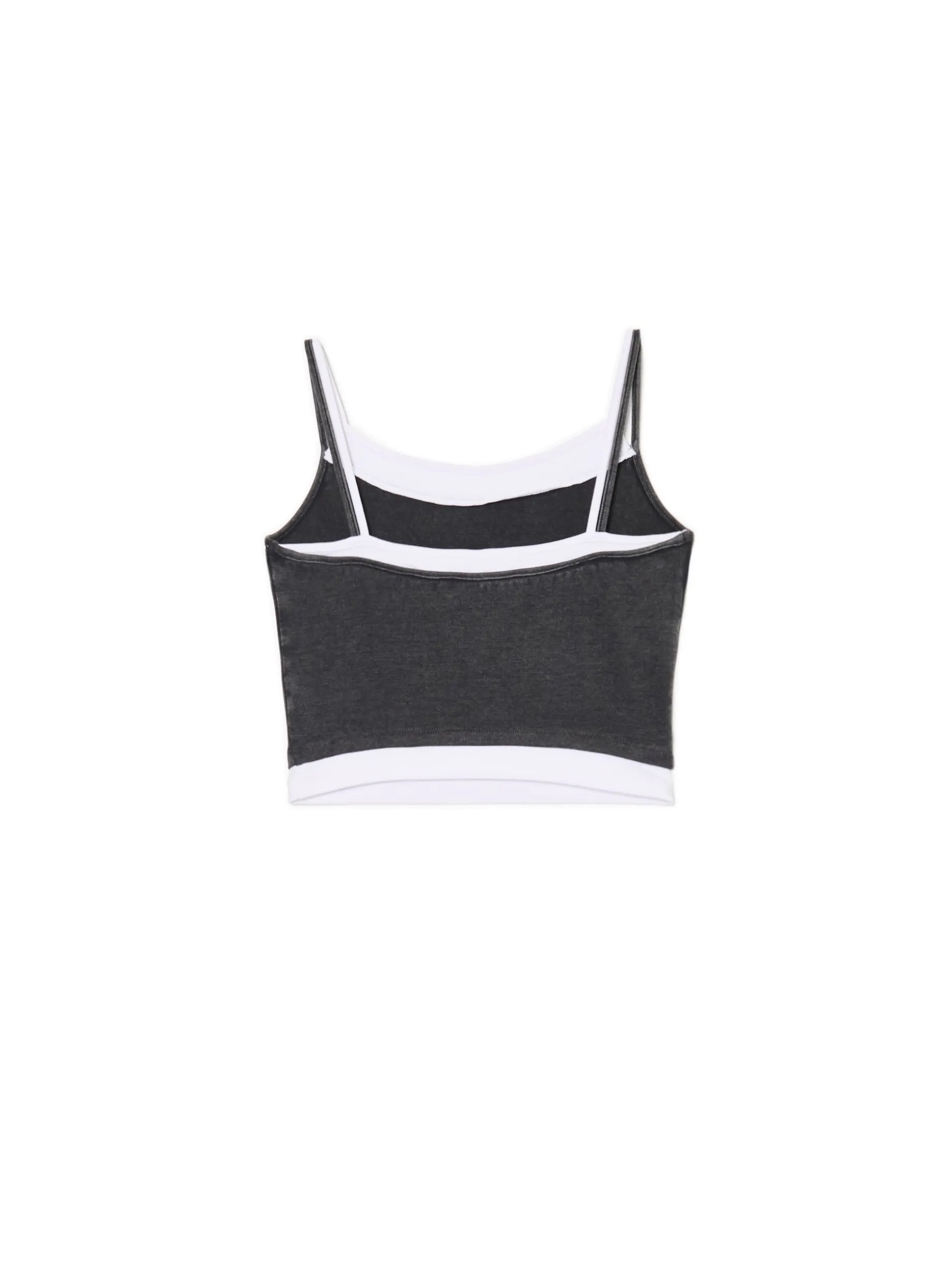 Damska koszulka na ramiączkach uszyta z elastycznej mieszanki dzianin. Dodatkowe wstawki na brzegach imitują podkoszulkę. Oryginalny casual, który fituje z bluzami i szerokimi spodniami. bawełna z dodatkiem elastycznych włókien dopasowany krój podkreślający sylwetkę cienkie ramiączka ozdobne wstawki Tworzy zestaw z modelem 591AR-90M . Wzrost modelki: 177 cm