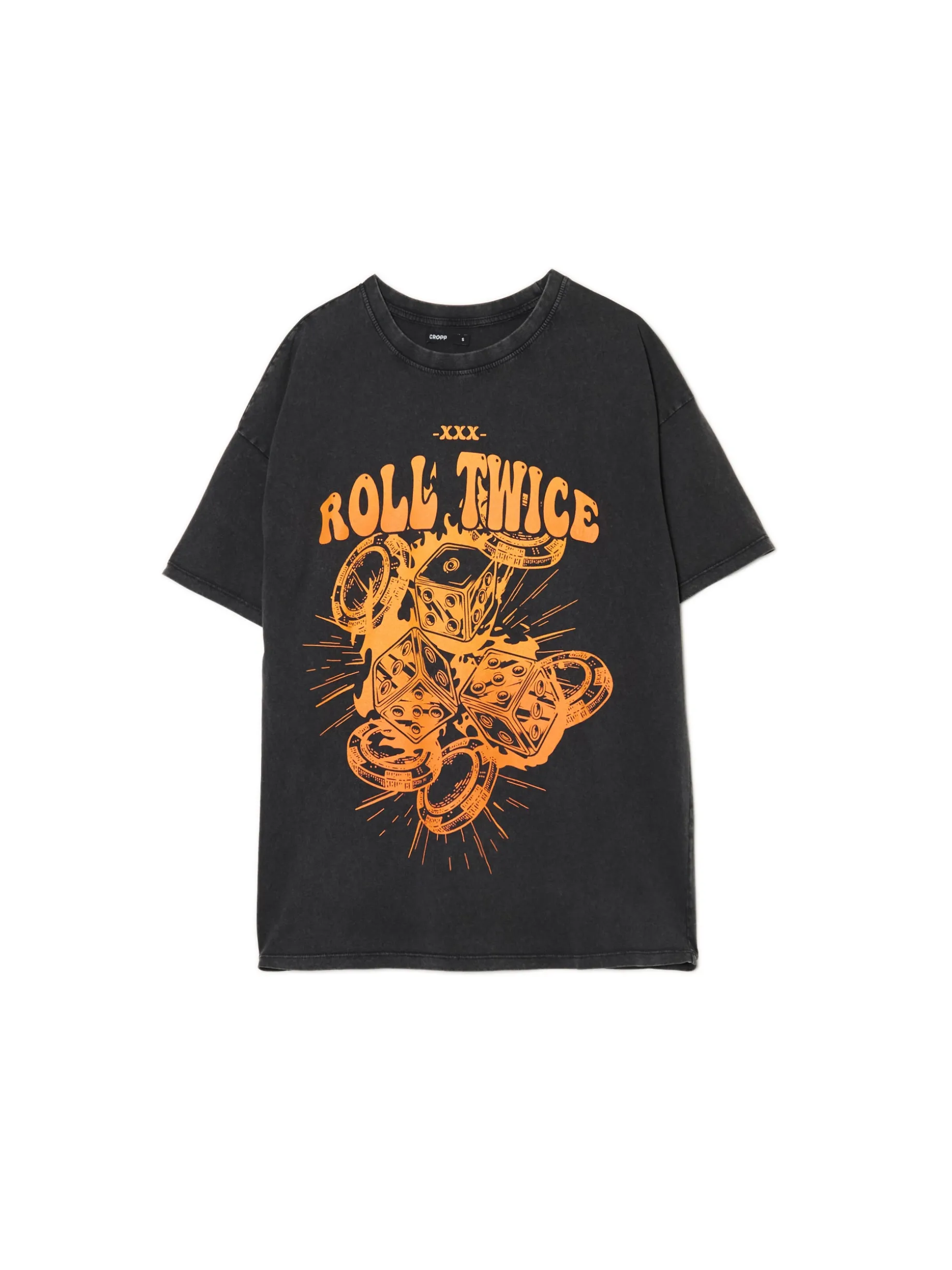 Bawełniana damska koszulka uszyta z dzianiny w kolorze szarym i efektem sprania. Na przodzie duży nadruk z motywem kości. 100% bawełny krój oversize krótkie, swobodne rękawy delikatnie obniżona linia ramion półokrągły dekolt z lamówką efekt sprania na całości duży nadruk z przodu
