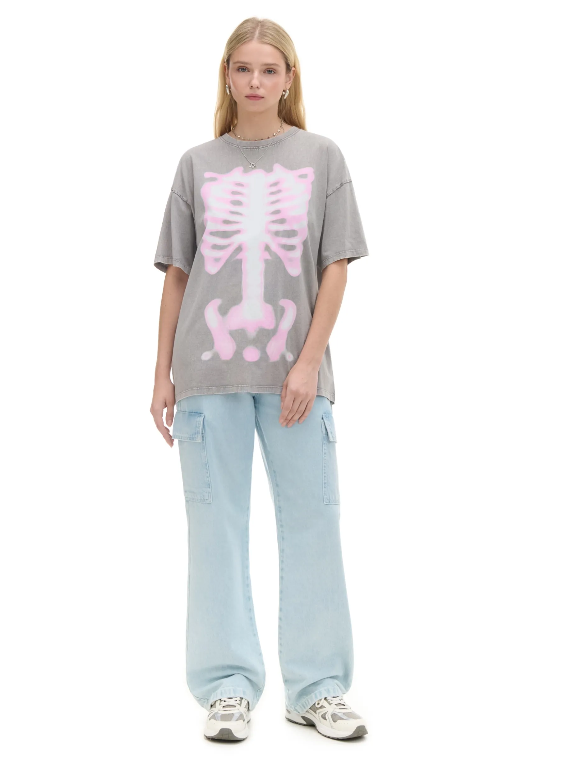 Damski T-shirt o kroju oversize, uszyty z bawełnianego materiału. W tym modelu szary kolor z efektem sprania i nadruk rentgena zwracają na siebie uwagę. 100% bawełny krój oversize krótkie, swobodne rękawy duży nadruk z przodu delikatnie obniżona linia ramion efekt sprania na całości Ten produkt należy do kolekcji UNISEX – zalecamy wybranie mniejszego rozmiaru niż zazwyczaj, jeśli chcesz uniknąć efektu oversize.