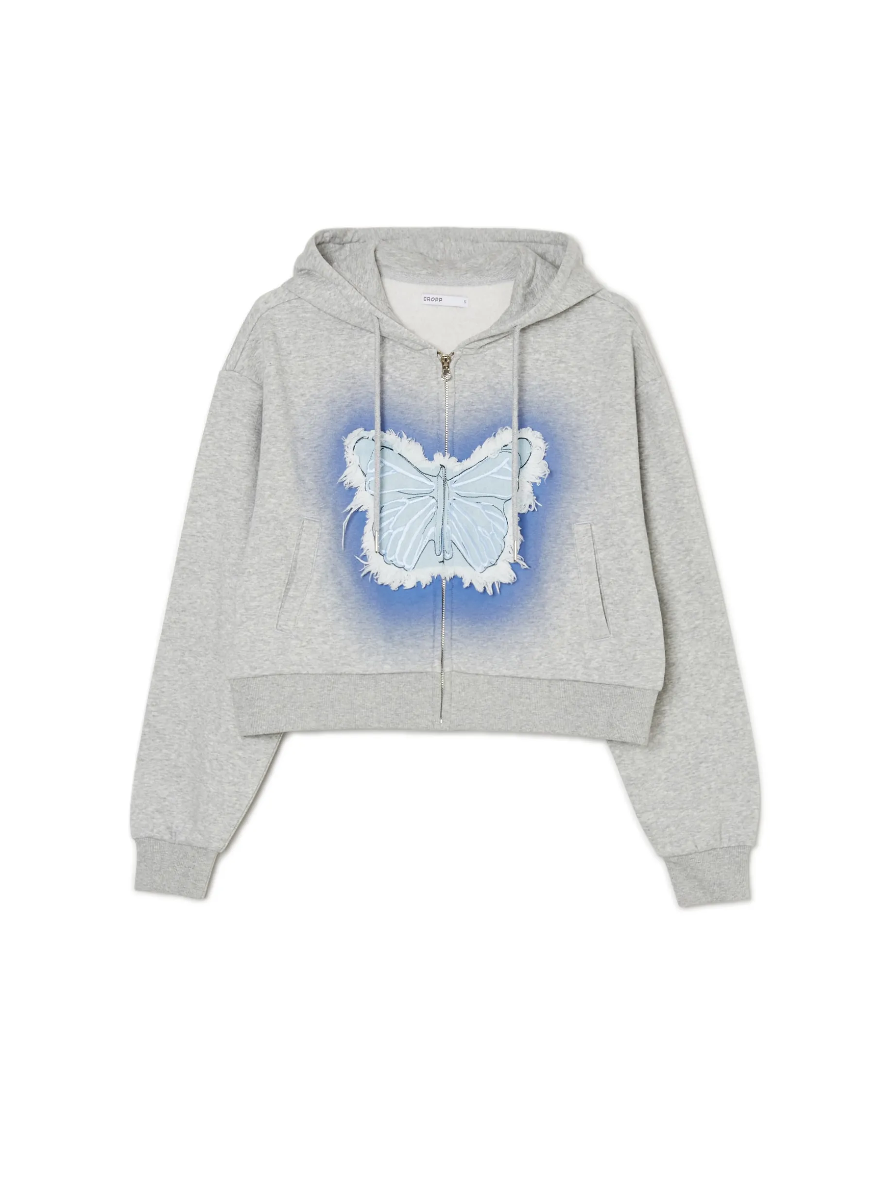 Jasnoszara, melanżowa damska bluza o krótkim kroju, uszyta z mieszanki dzianin zawierającej bawełnę. Must have na letnie wypady z ekipą! krótki krój typu crop zapięcie na zamek na całej długości szeroki kaptur z trokami dwie kieszenie z przodu dolny brzeg i rękawy wykończone ściągaczem ozdobna denimowa aplikacja w kształcie motyla
