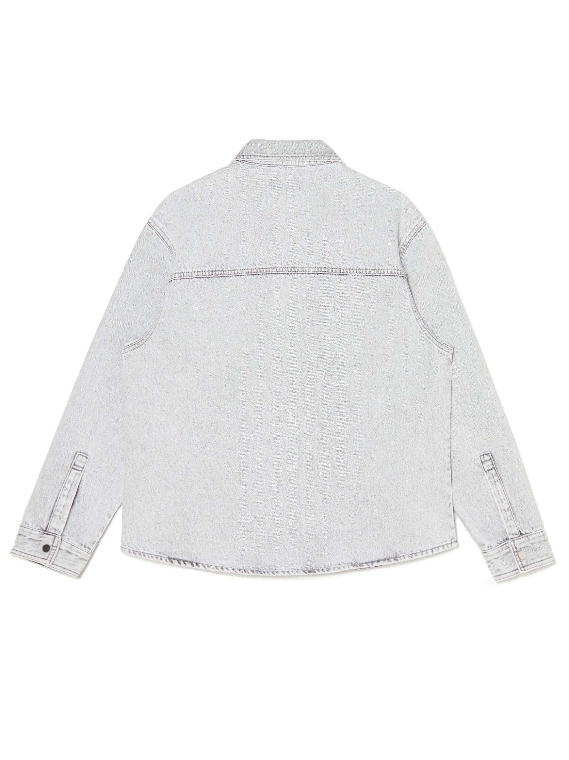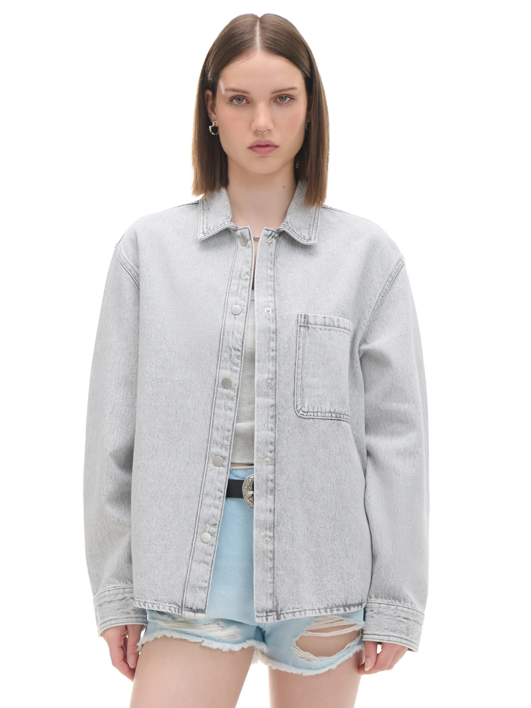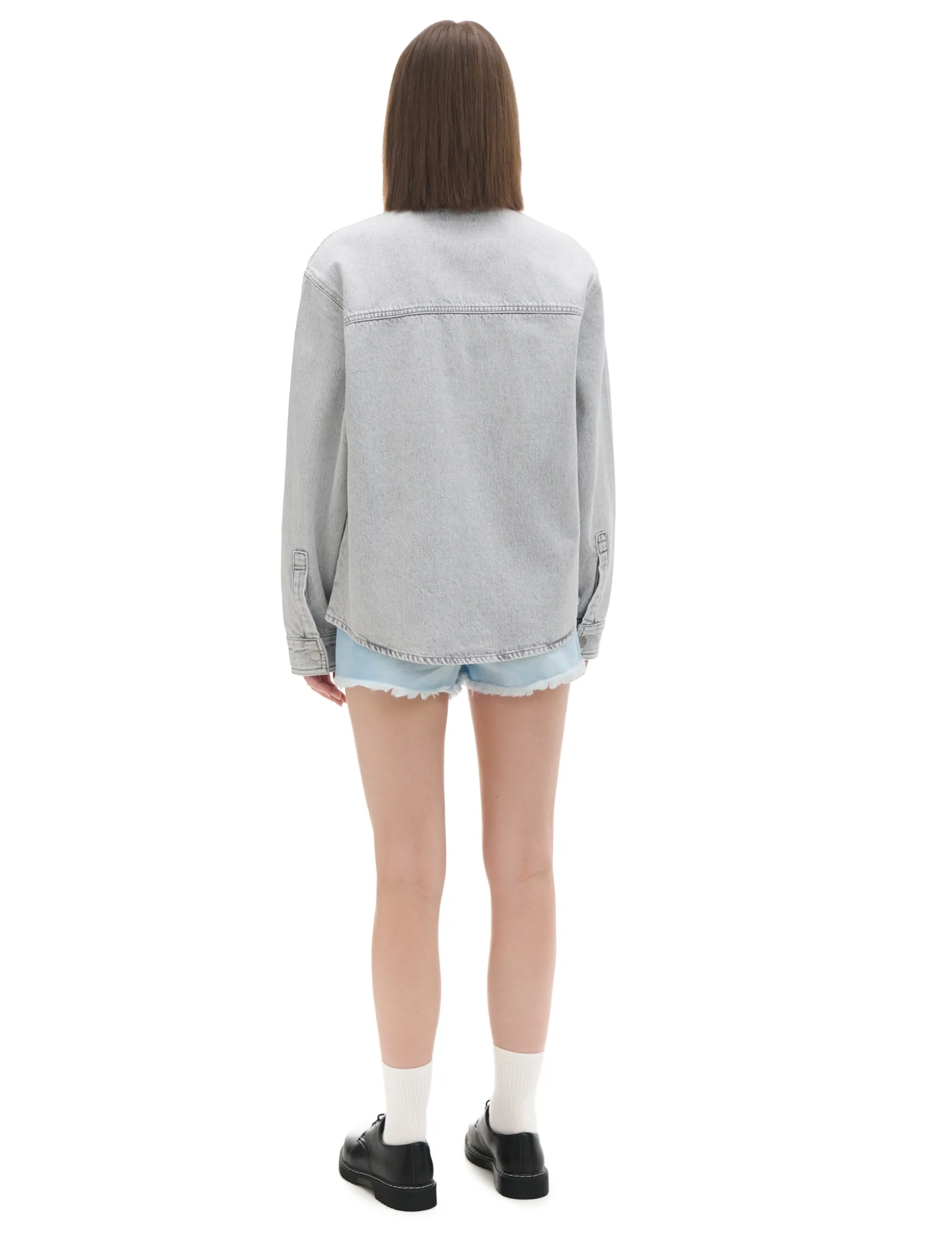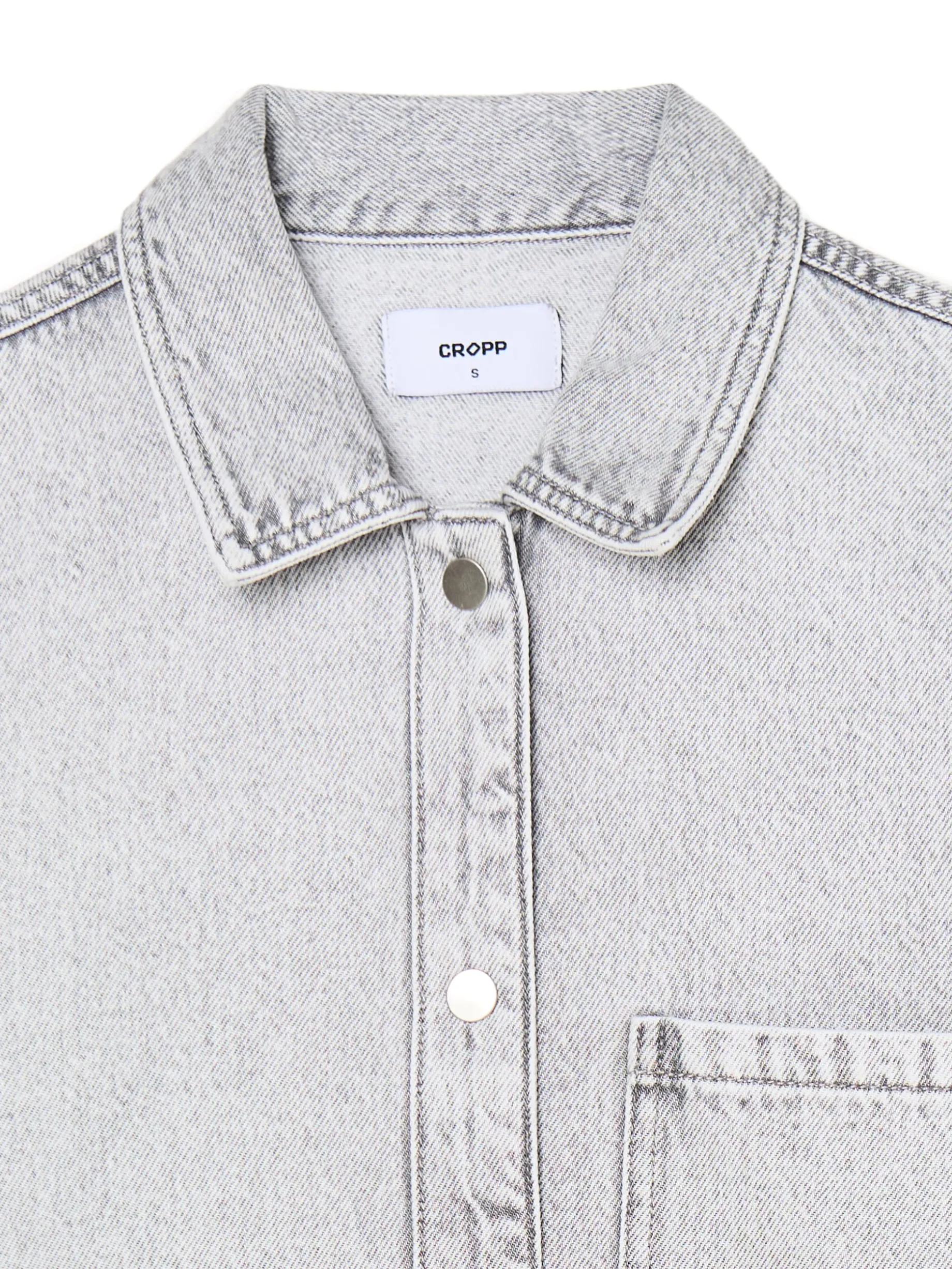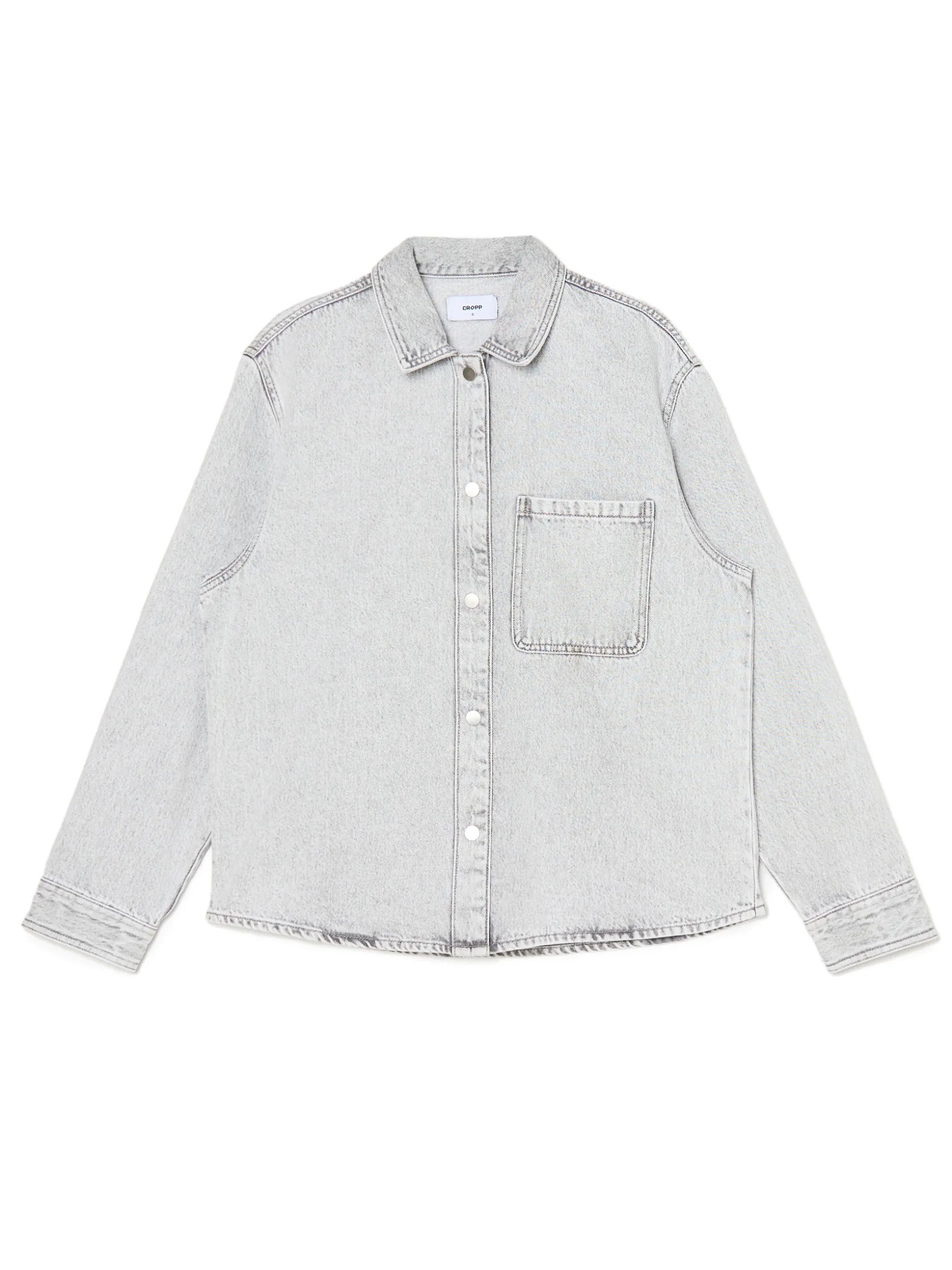 Damska kurtka jeansowa w kroju koszuli, uszyta z bawełnianej tkaniny z efektem sprania. Poczuj ten vibe! 100% bawełny koszulowy krój zapinana na napy wykładany kołnierz długie rękawy z zatrzaskami przy mankietach lekko obniżona linia ramion naszywana kieszeń na piersi