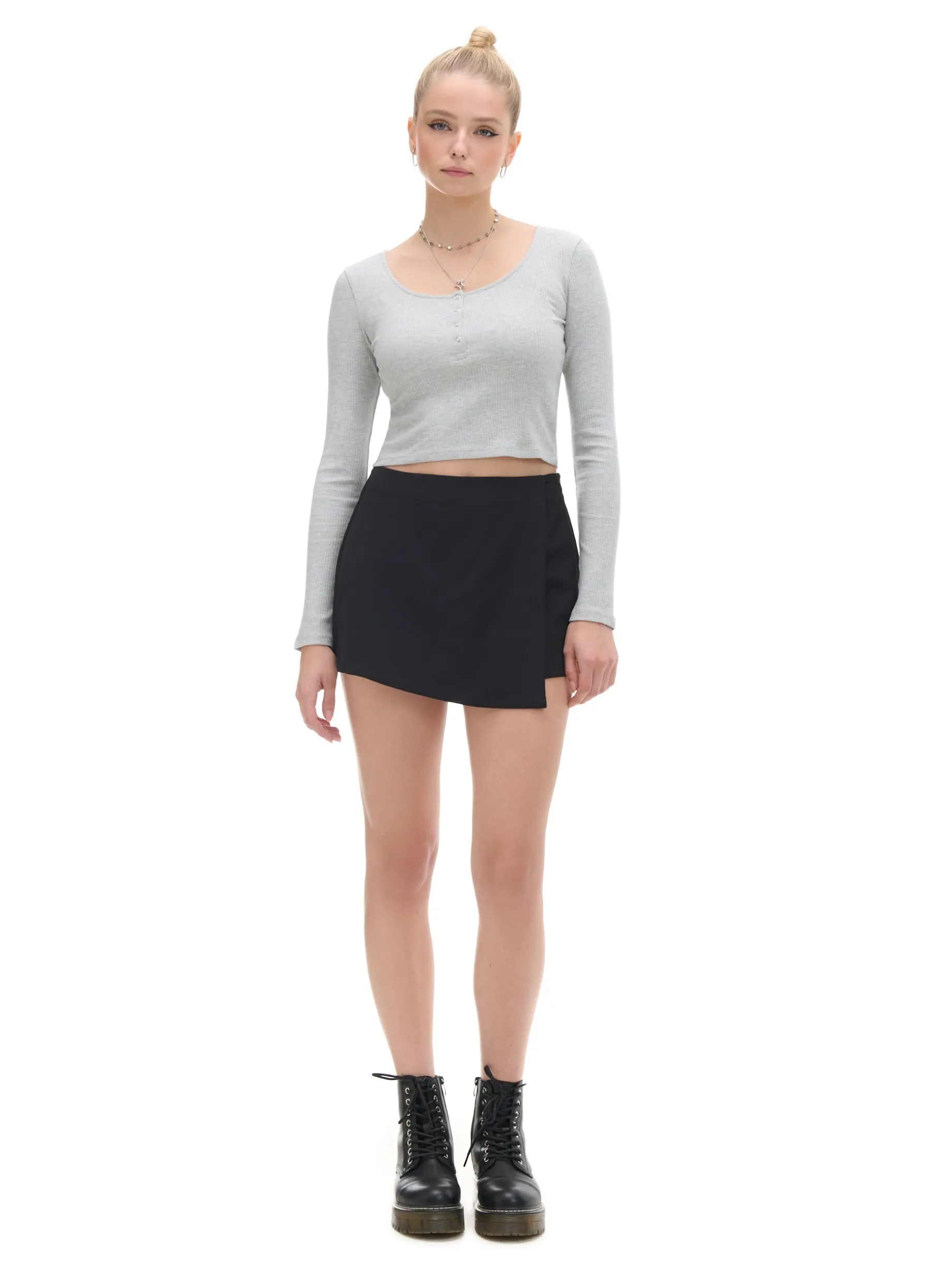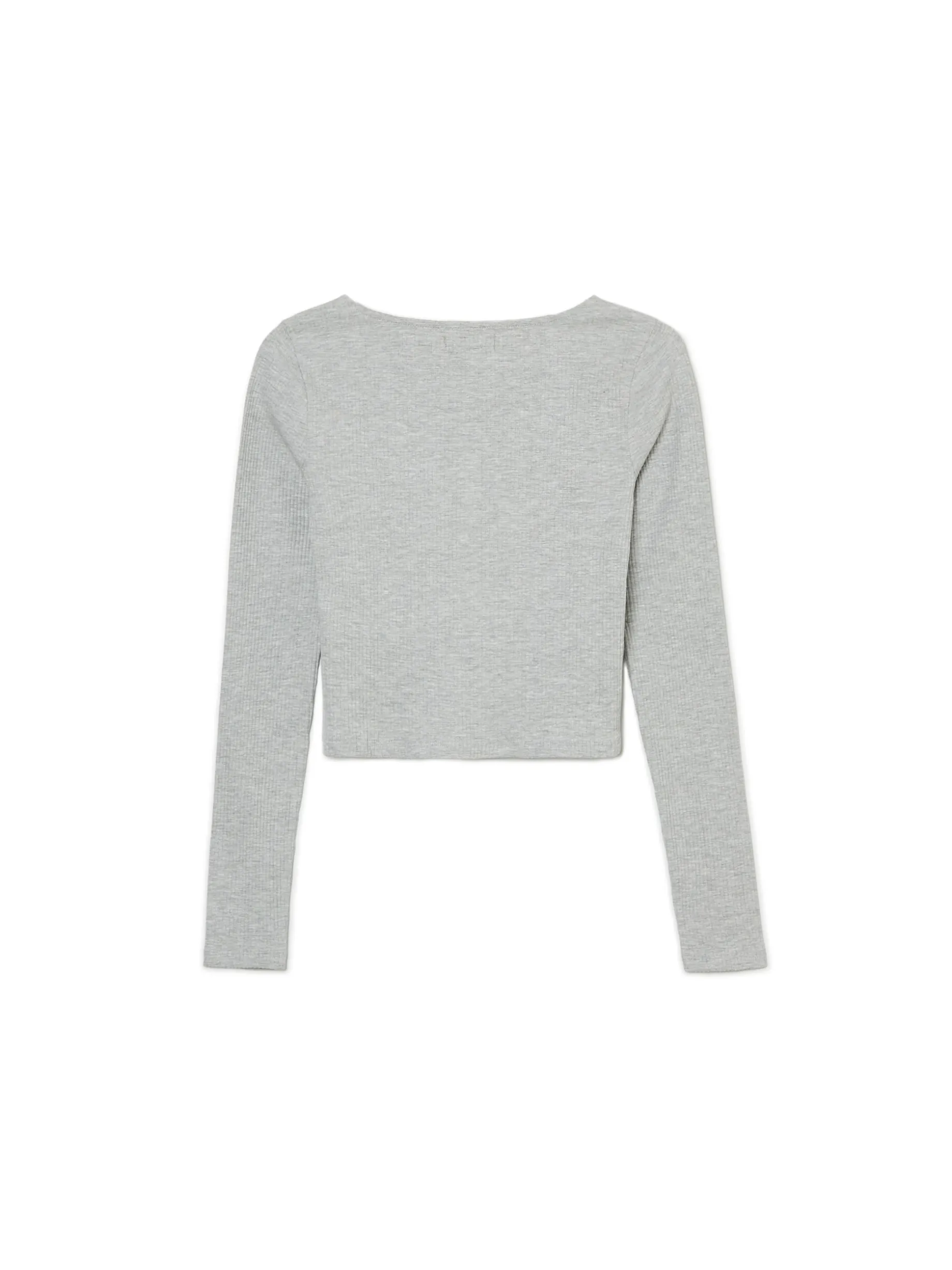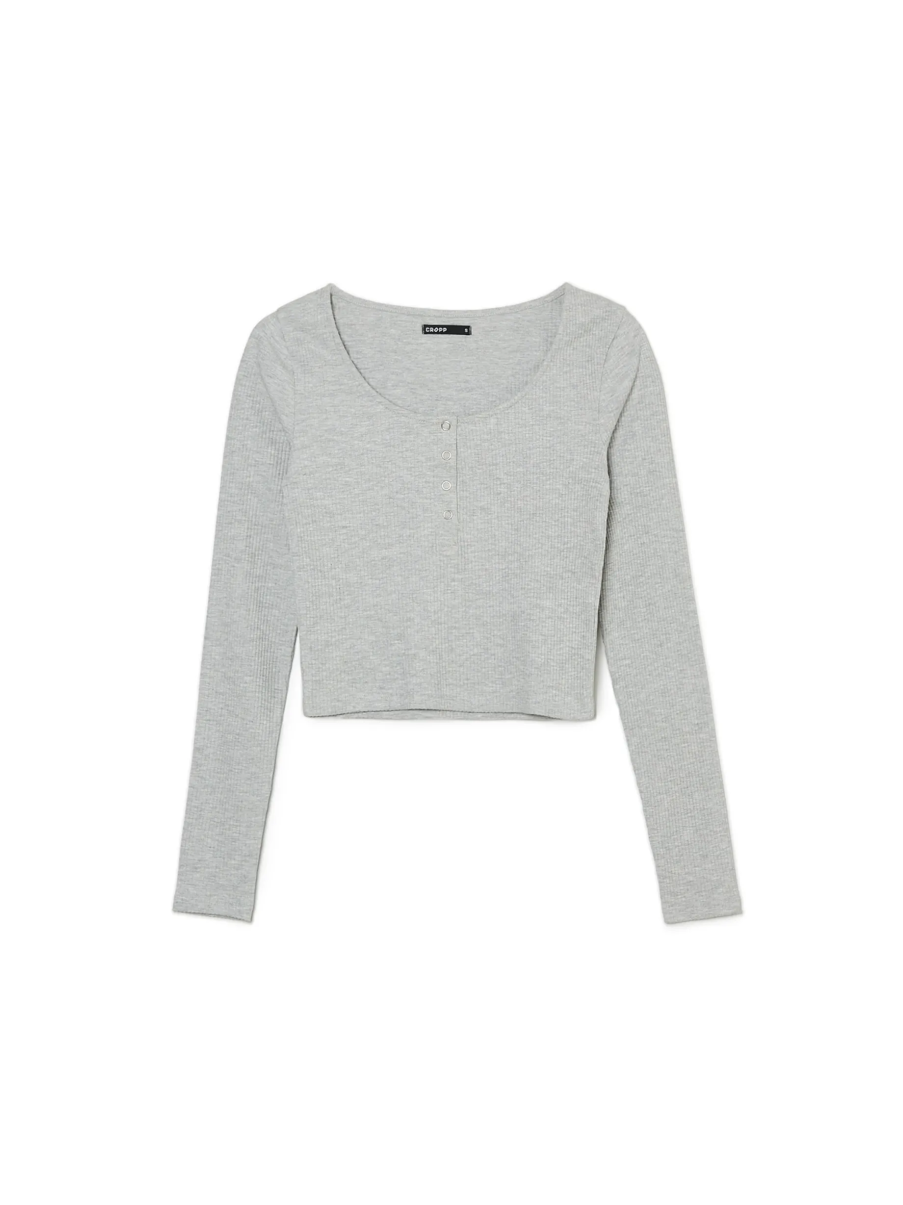 Szara damska bluzka, uszyta z mieszanki wiskozy i elastanu. Dobierz do niej oryginalne dodatki! dopasowany krój podkreślający sylwetkę długie, dopasowane rękawy góra zapinana na zatrzaski okrągły dekolt z lamówką