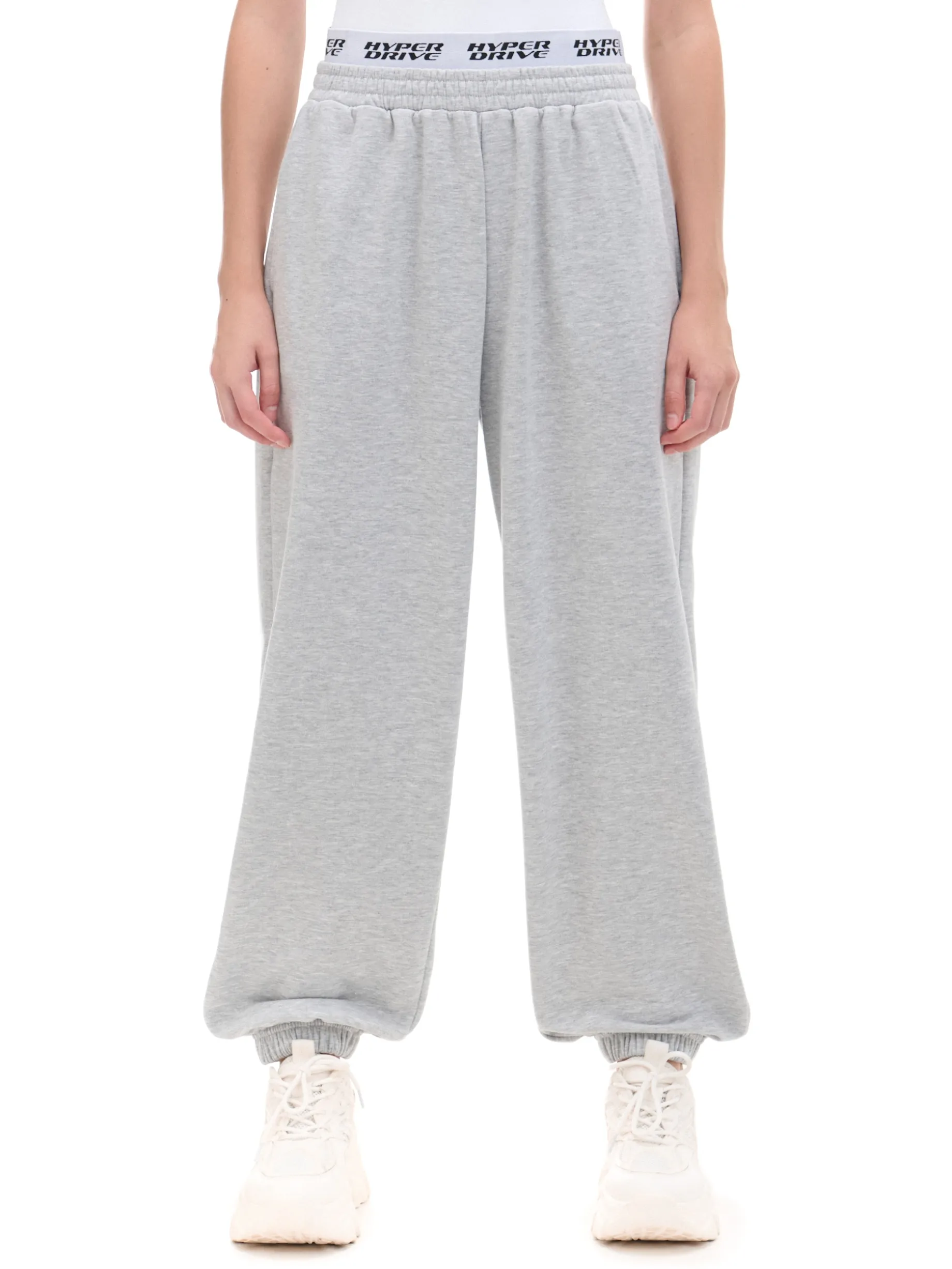Dzianinowe damskie spodnie o sportowym kroju, uszyte z mieszanki materiałów z dodatkiem bawełny french terry. Te miękkie, wygodne i wytrzymałe joggery są gotowe na każdy rodzaj aktywności. dresowe spodnie typu jogger dzianinowy materiał z bawełną długie nogawki zwężane ku dołowi, wykończone ściągaczem w pasie od wewnątrz wszyta gumka dodatkowa guma z nadrukiem