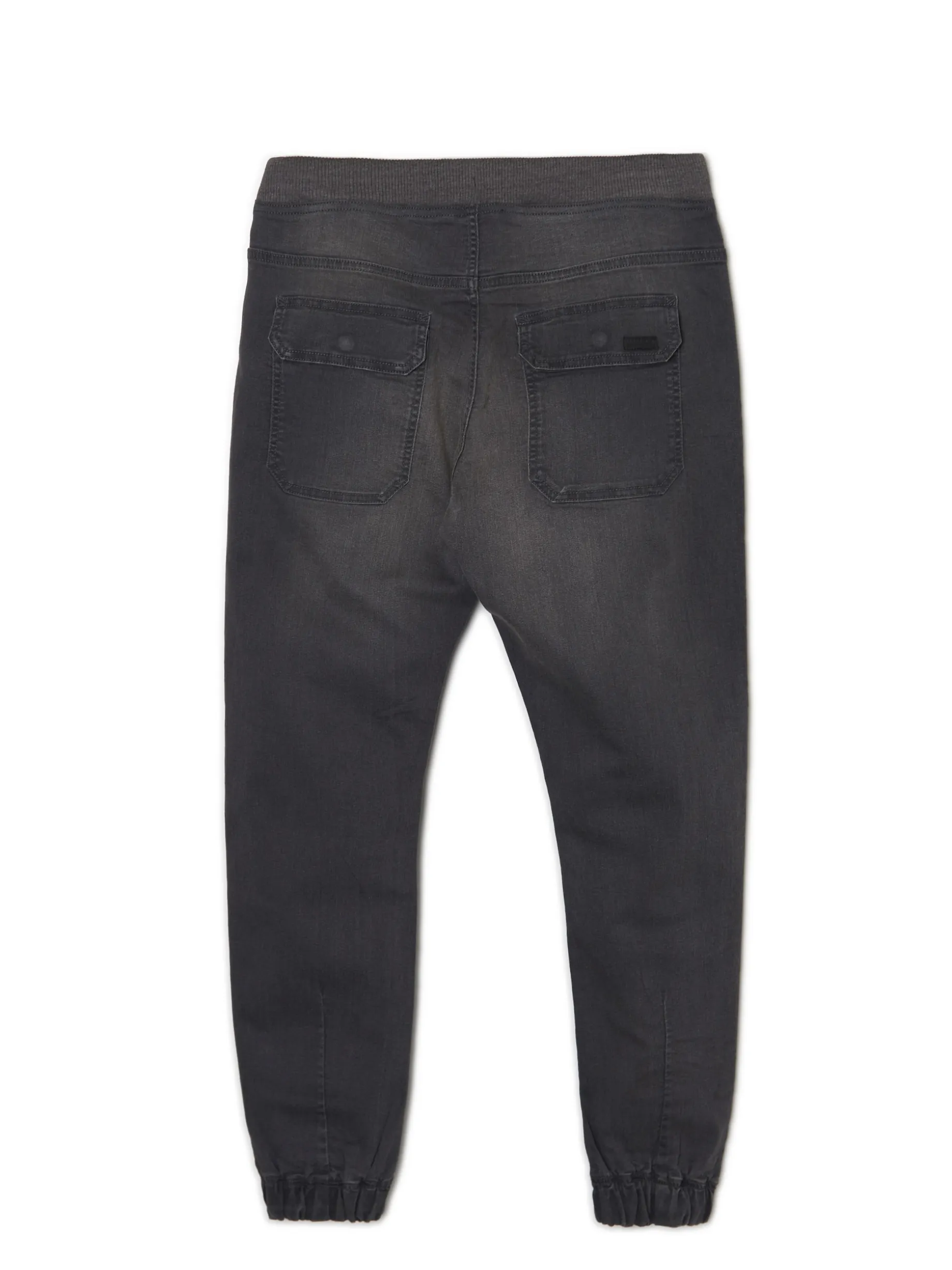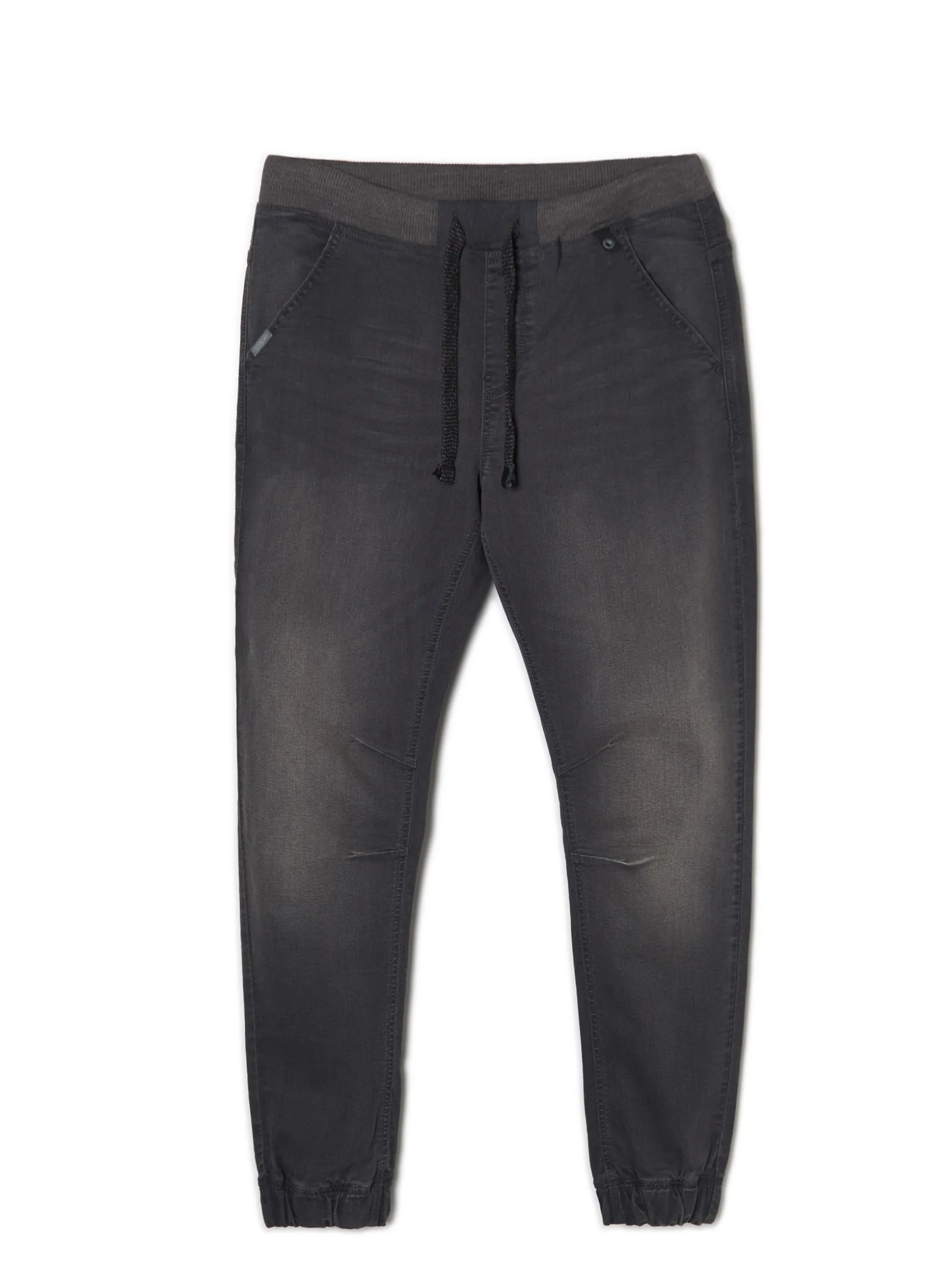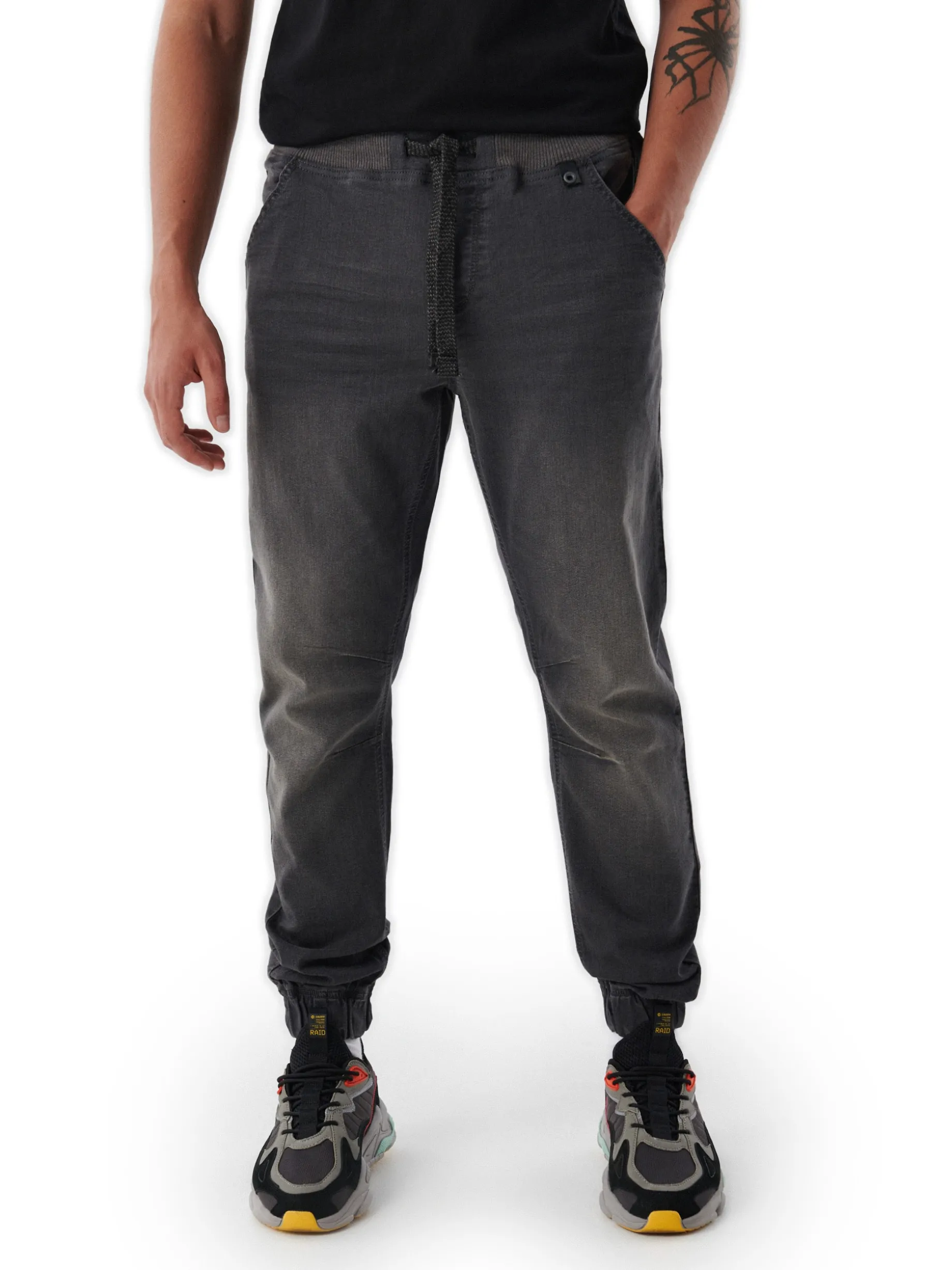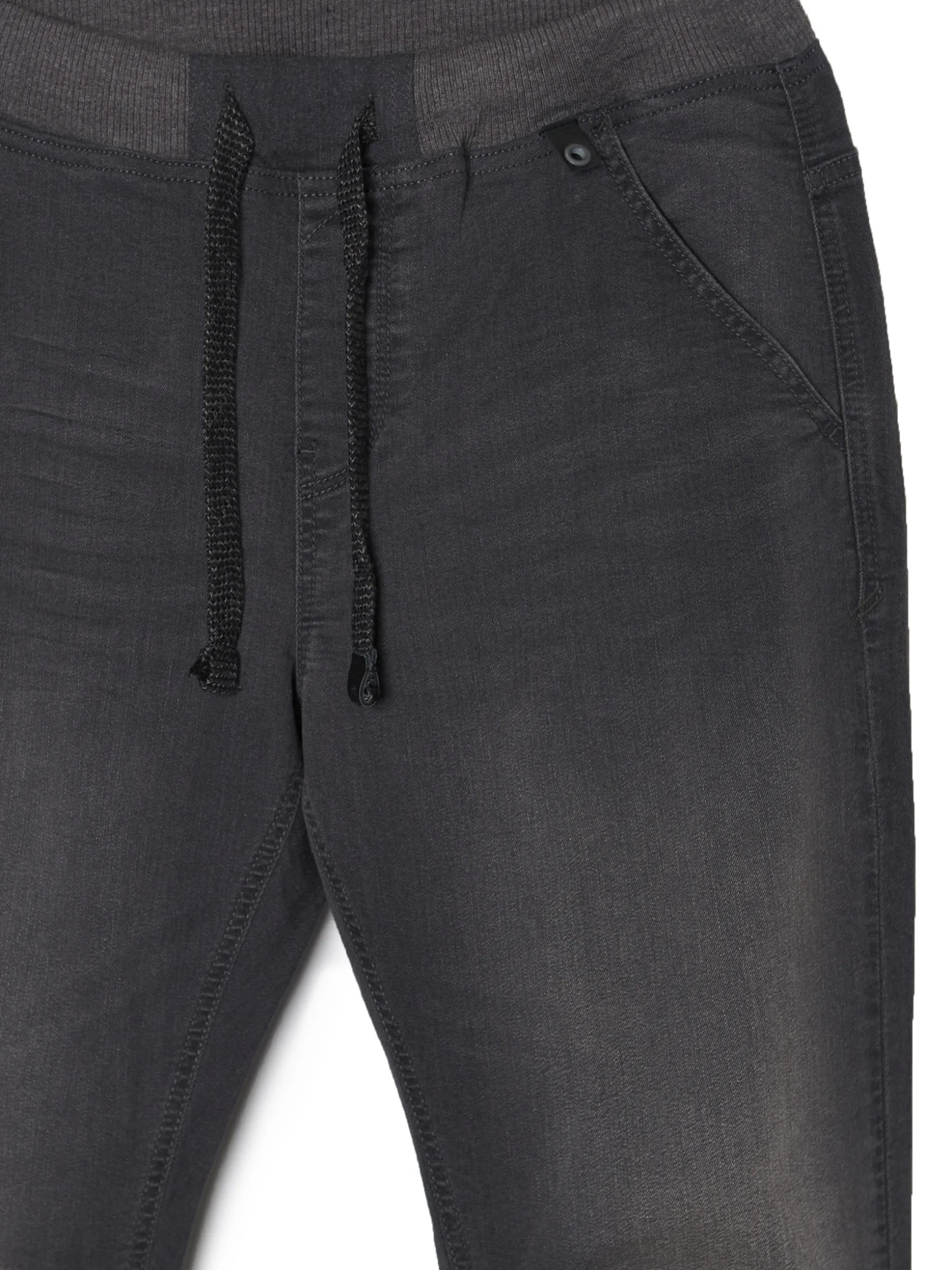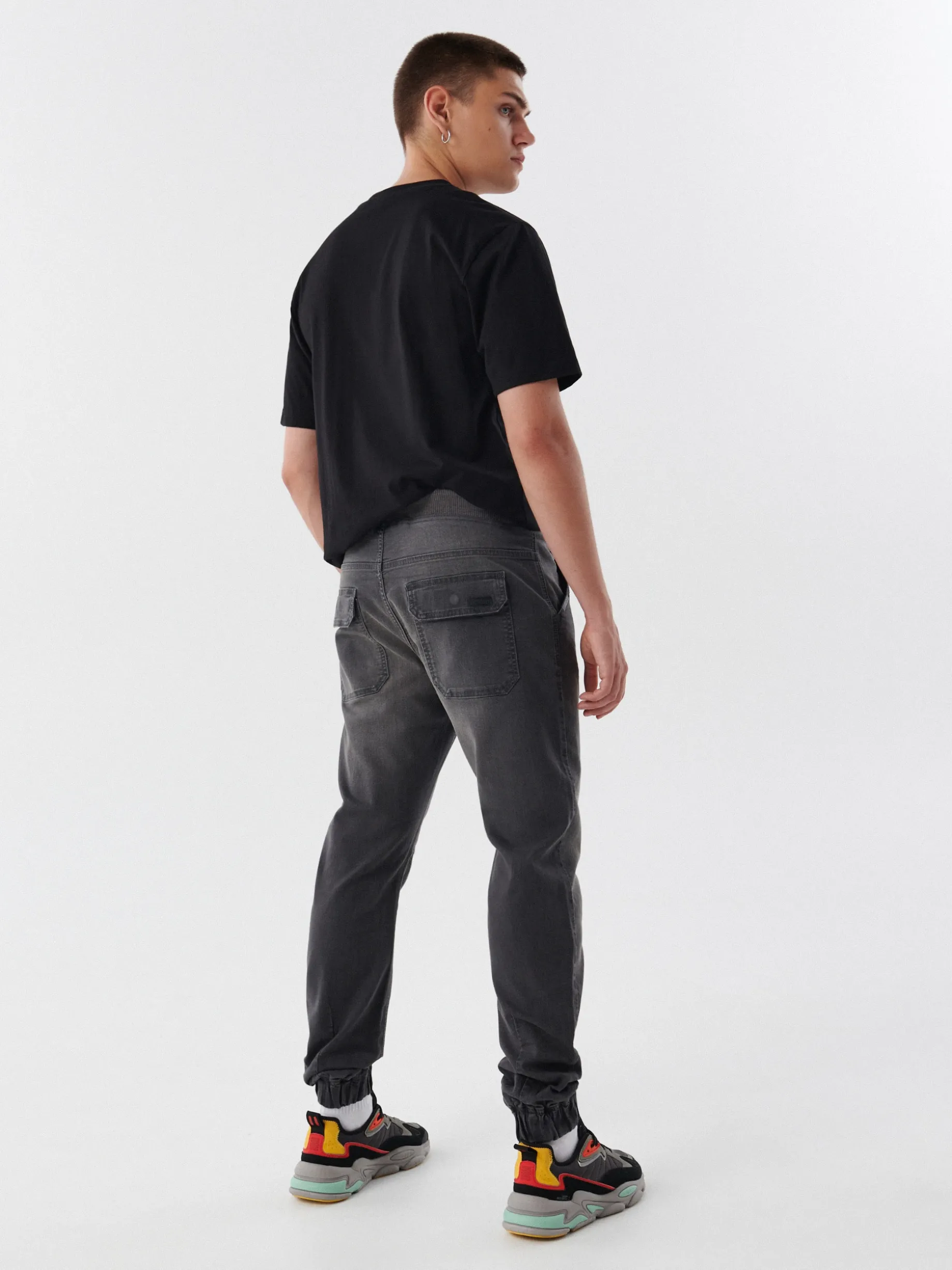 Męskie spodnie jeansowe, uszyte z tkaniny o wysokiej zawartości bawełny. wygodny krój jogger regularny stan elastyczna gumka w pasie i sznurek do regulacji, pas wykonany z miękkiego, dzianinowego ściągacza długa, wąska nogawka zakończona gumką cztery kieszenie, w tym dwie zapinane na zatrzaski mocny efekt sprania dostępne w innych kolorach