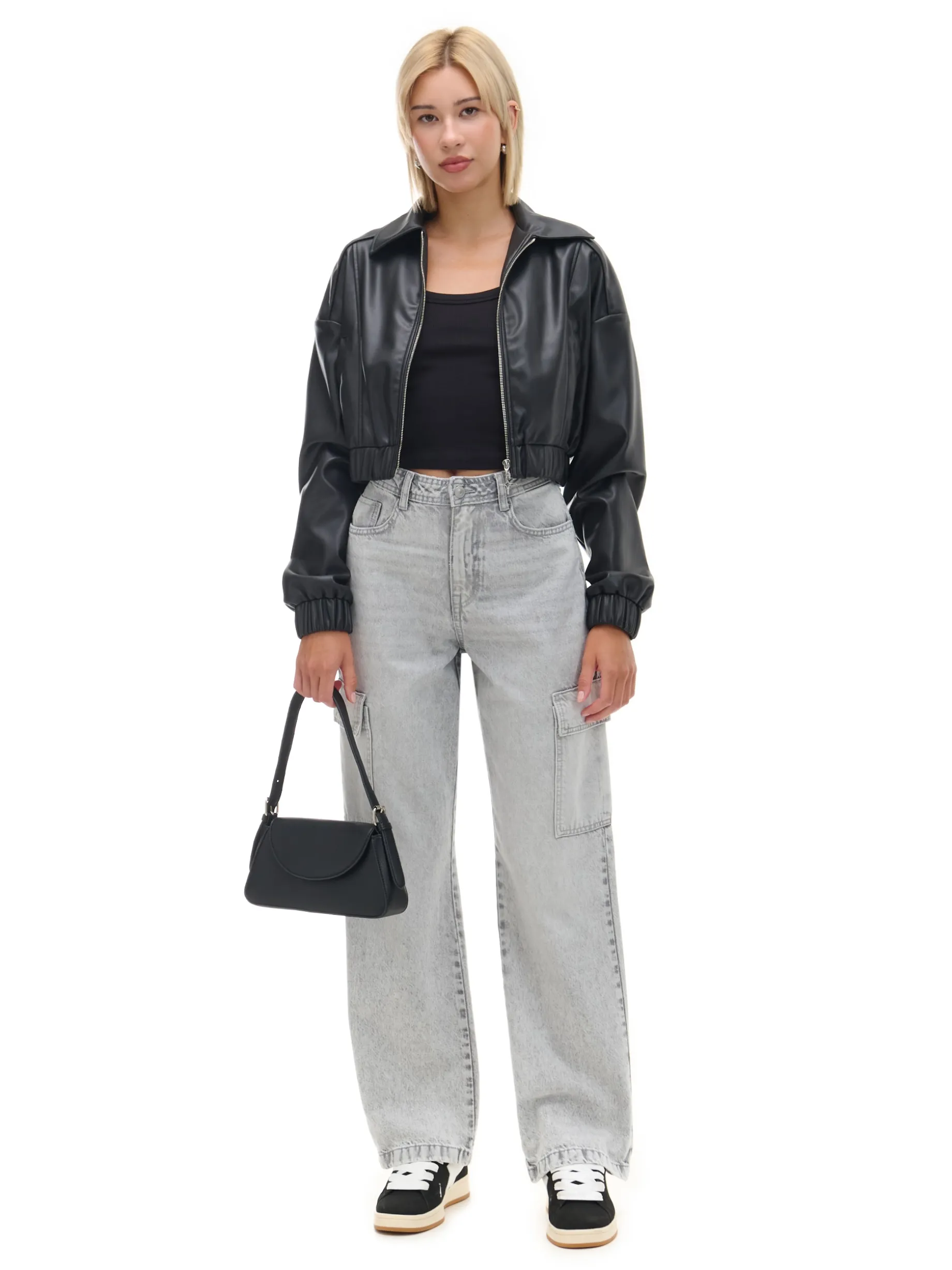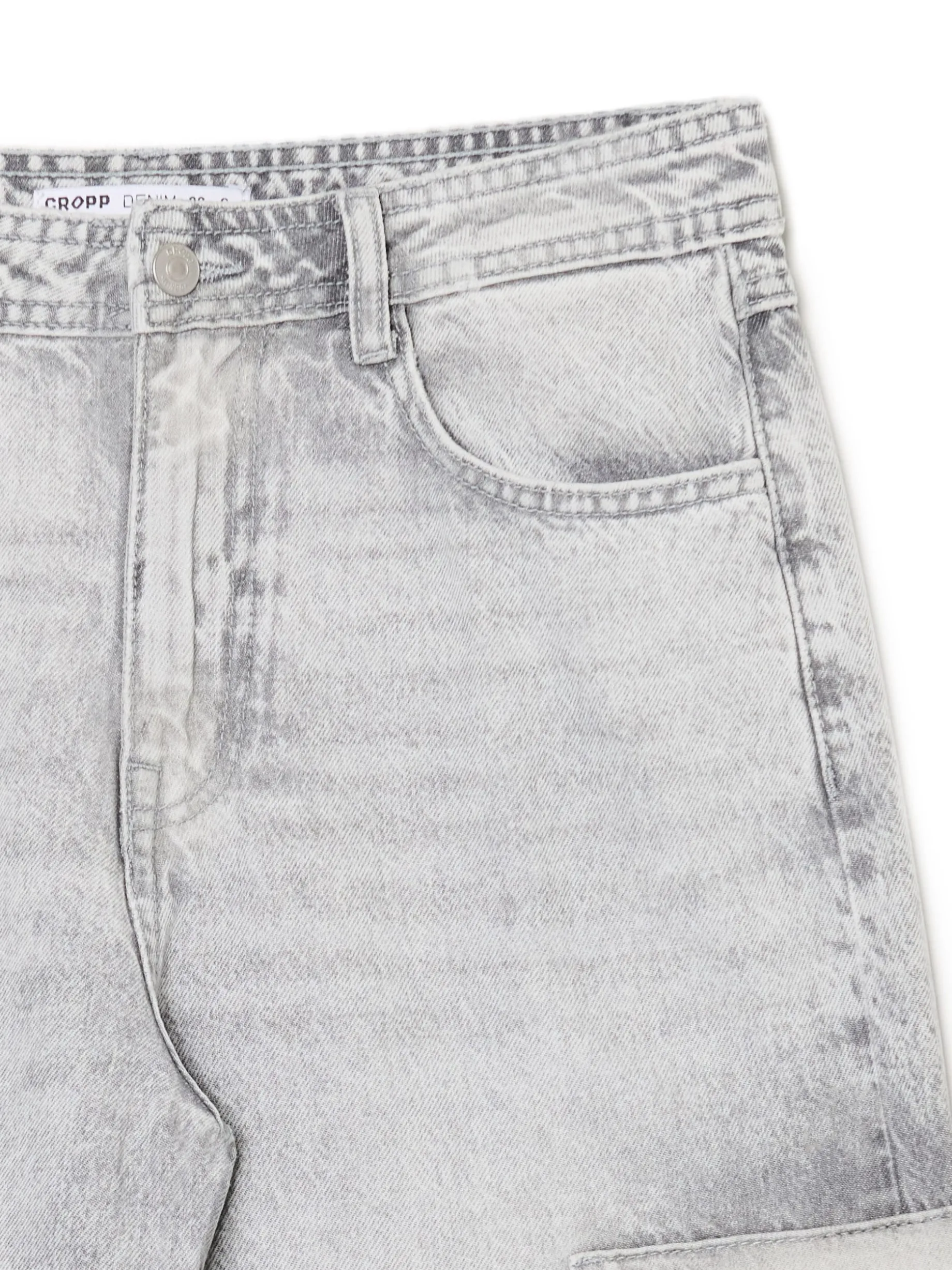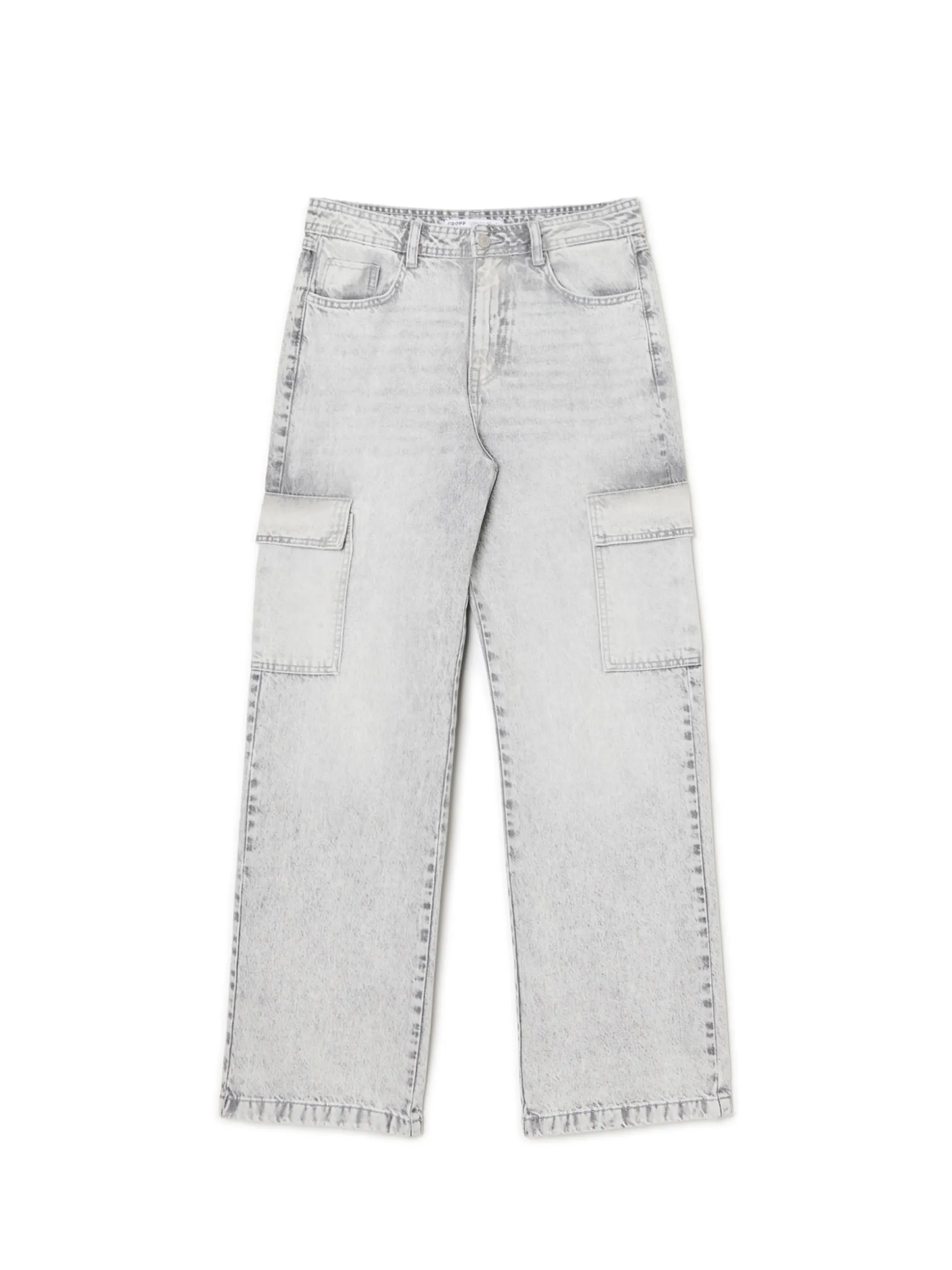 Damskie spodnie jeansowe uszyte z bawełnianej tkaniny. Szerokie nogawki, praktyczne kieszenie i szlufki blisko siebie – praktyczne rozwiązanie na pasek lub zmęczone ręce po całym dniu. denim o szarym odcieniu z delikatnym efektem sprania obszerny krój baggy zapięcie na zamek i guzik długie, szerokie nogawki pięć kieszeni dodatkowe kieszenie cargo na nogawkach Wzrost modelki: 177 cm