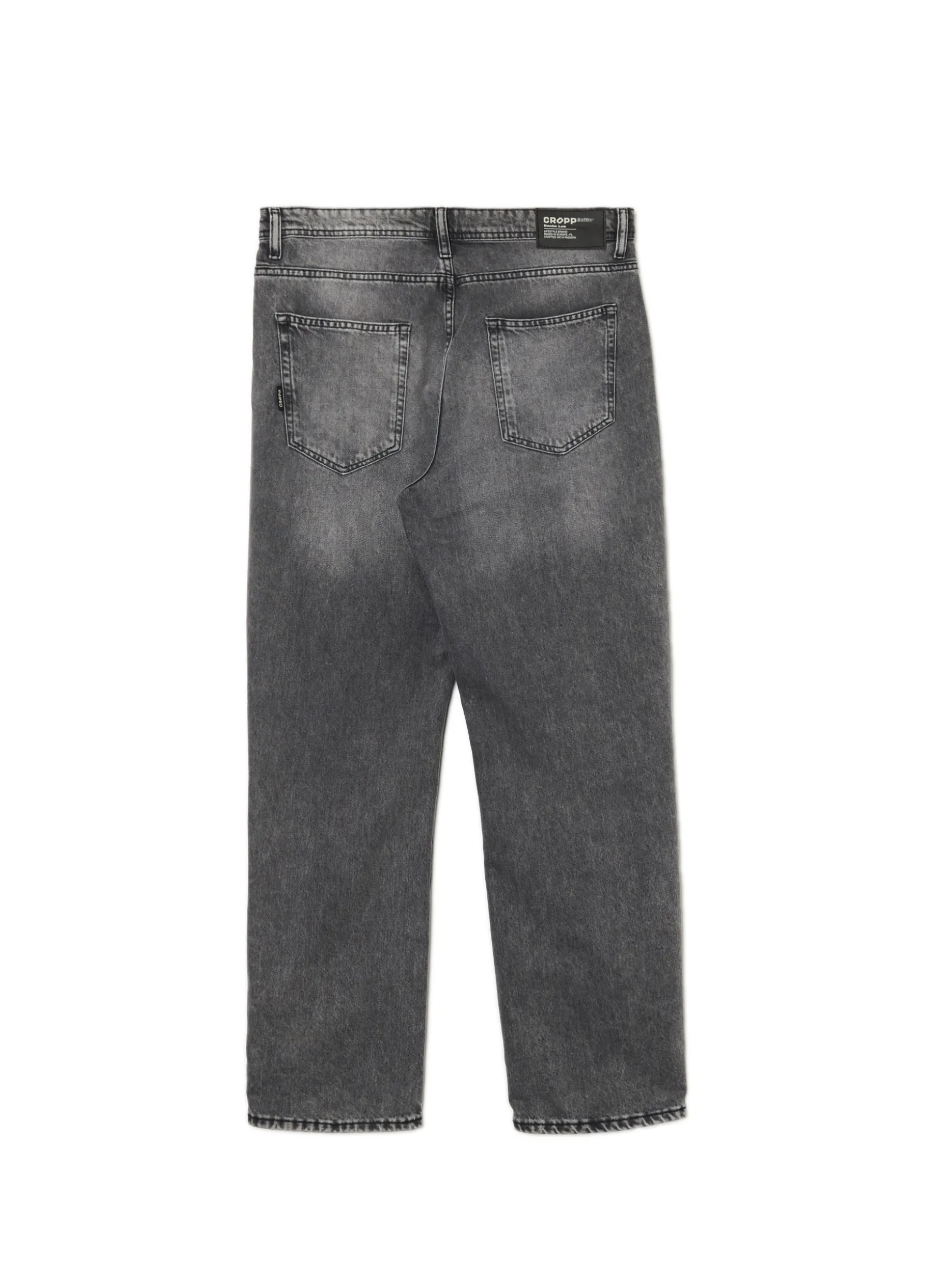 Męskie spodnie jeansowe typu relaxed, uszyte z bawełnianej tkaniny w szarym kolorze. Szlufki blisko siebie to praktyczne rozwiązanie na zmęczone ręce po całym dniu. Zrelaksuj się! denim o szarym odcieniu z delikatnym efektem sprania prosty krój zapięcie na zamek i guzik wąskie szlufki na pasek pięć kieszeni