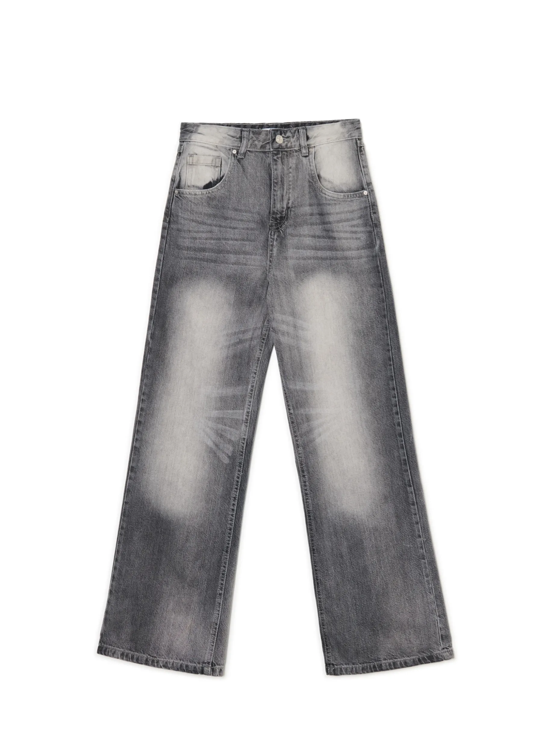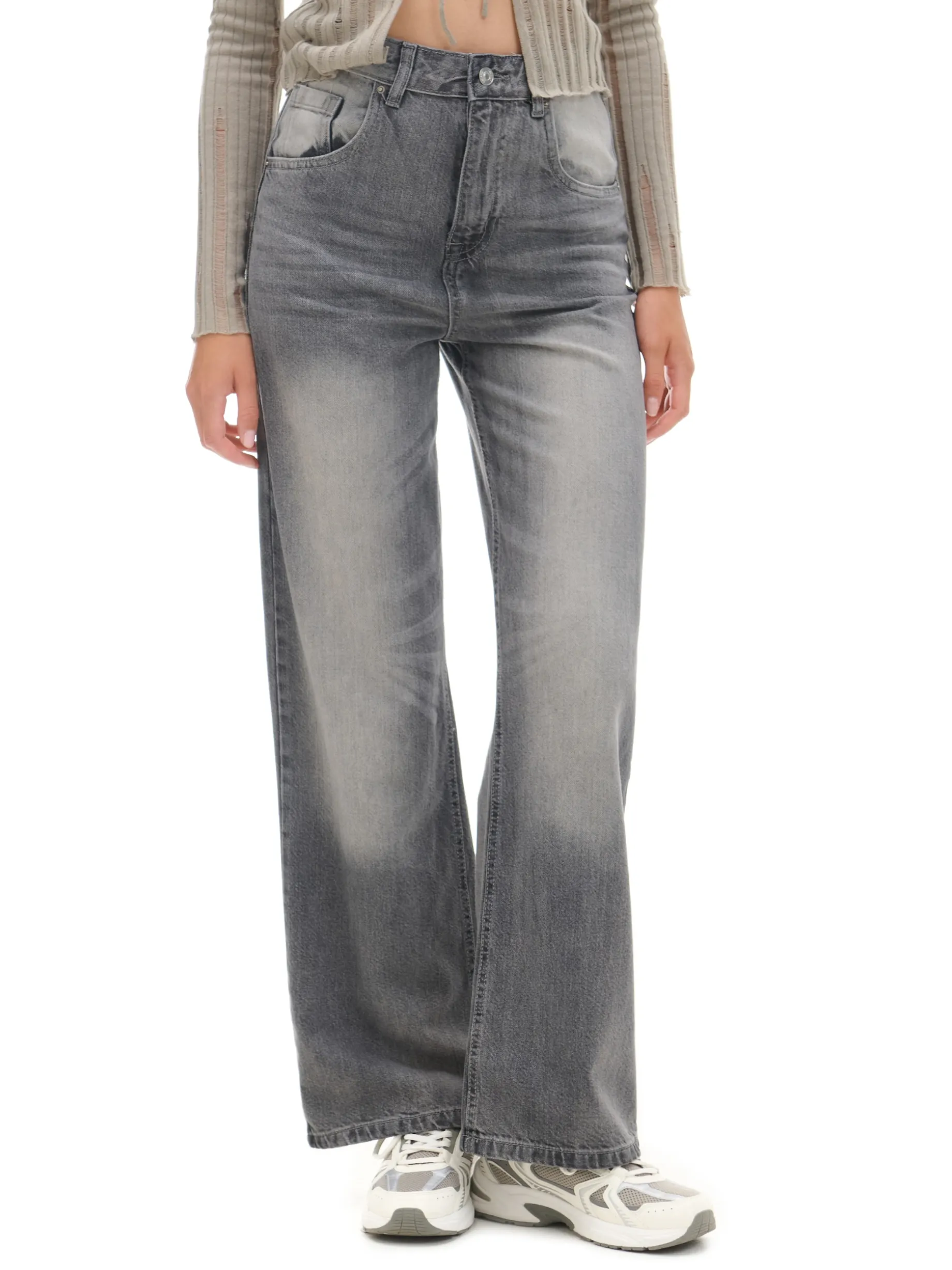 Damskie spodnie jeansowe uszyte z bawełnianej tkaniny. Szerokie nogawki, praktyczne kieszenie i wygodne zapiecie, zapewnią Ci komfort podczas każdej aktywności. denim o szarym odcieniu z delikatnym efektem sprania obszerny krój baggy zapięcie na zamek i guzik długie, szerokie nogawki pięć kieszeni Wzrost modelki: 177 cm