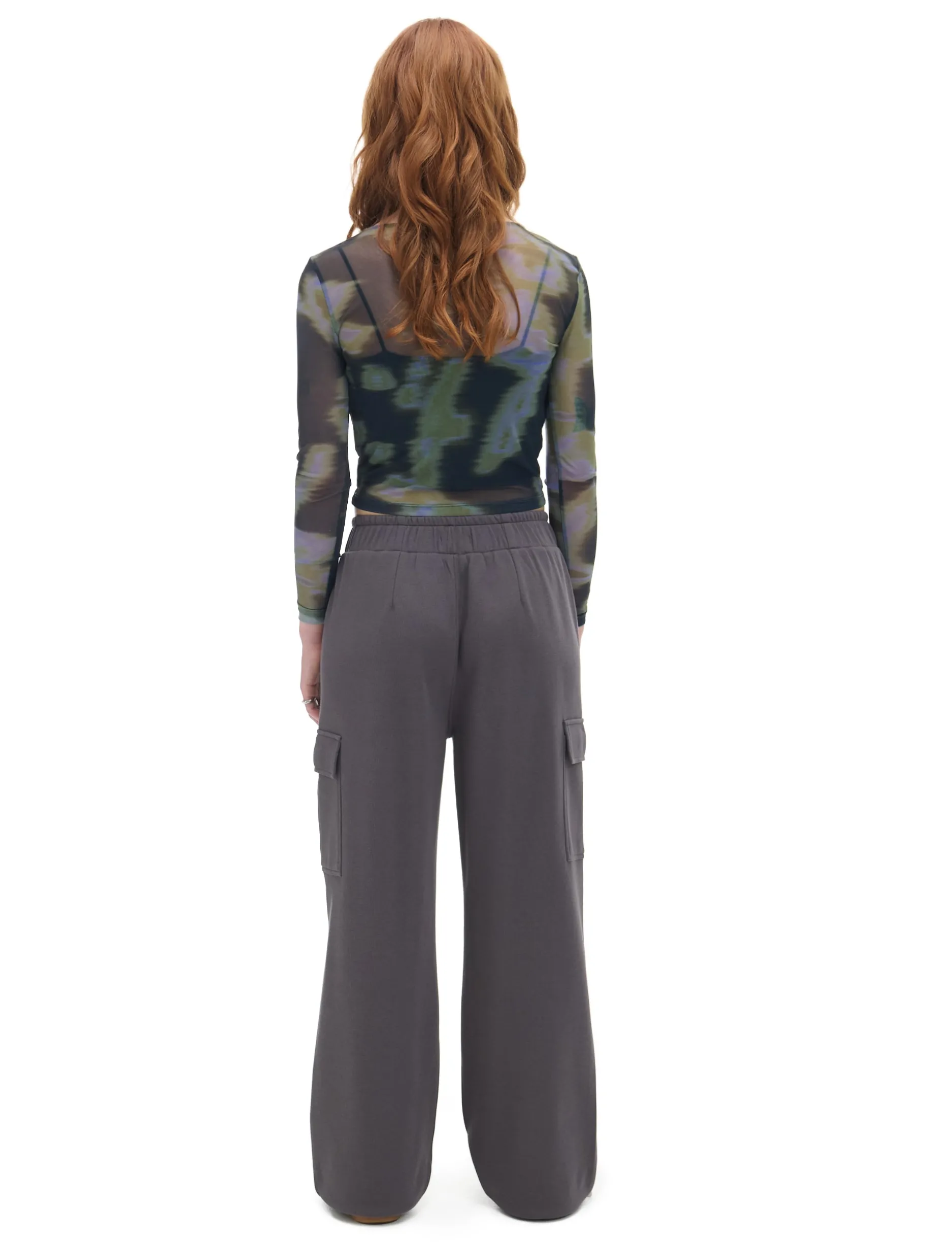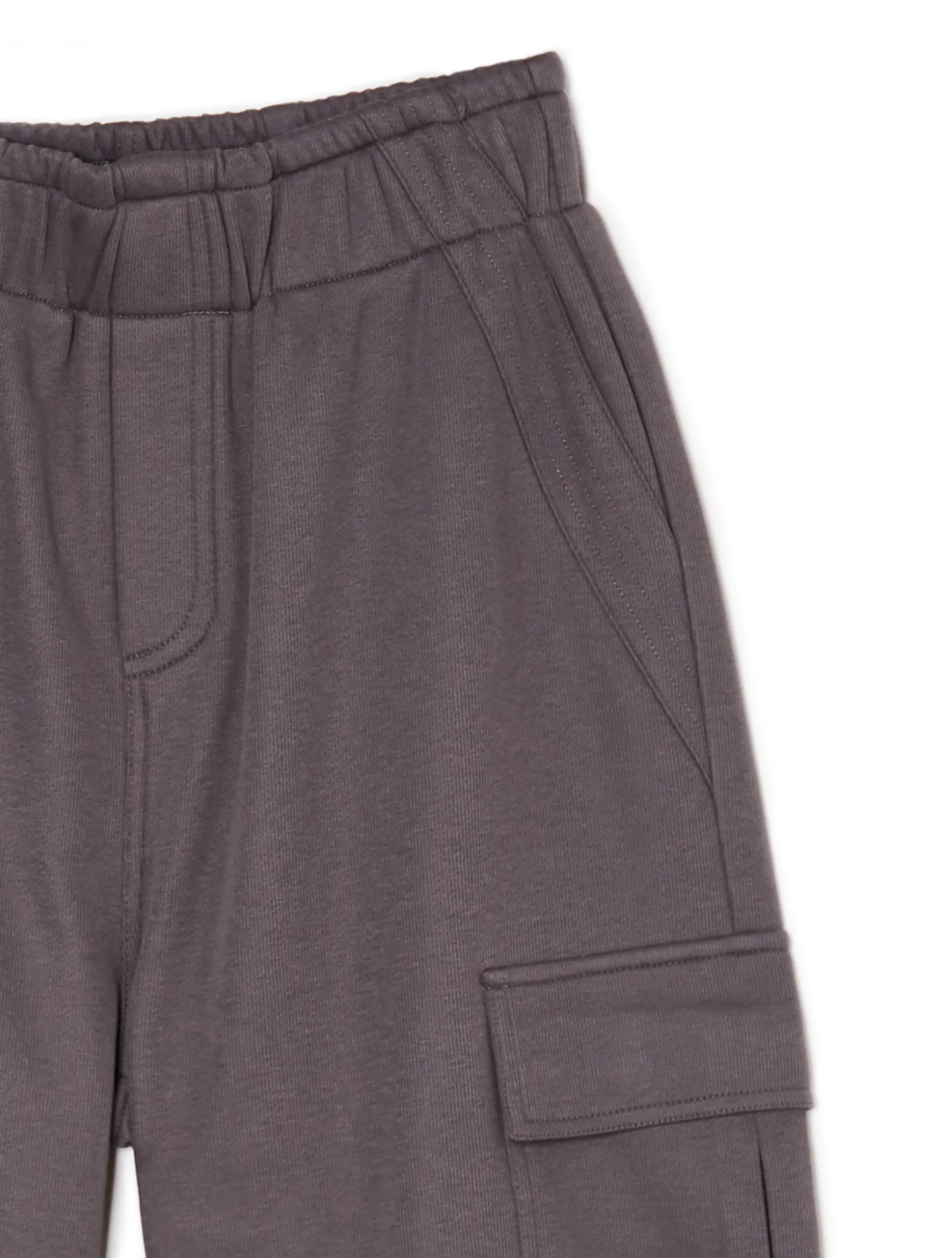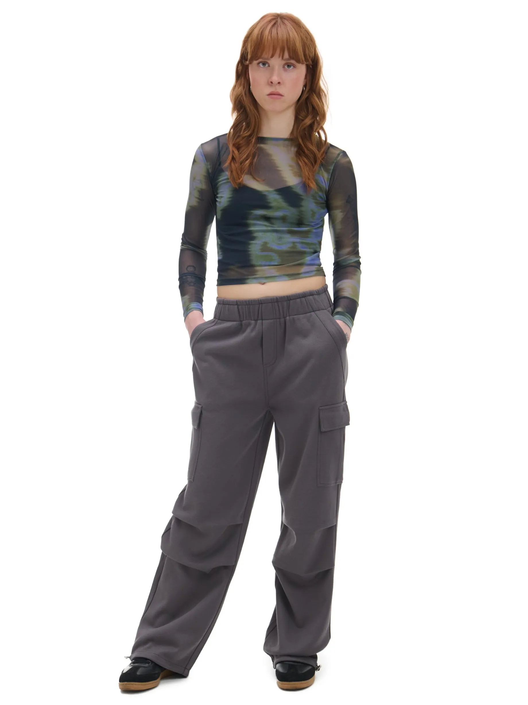 Te damskie spodnie typu cargo w stonowanym, szarym kolorze będą fitowały z Twoimi stylizacjami. materiał z dużą zawartością bawełny luźny krój typu cargo ze ściągaczami uniwersalna gumka w pasie para klasycznych kieszeni i typu cargo na nogawkach ozdobna imitacja zapięcia zagięcia w wersji parachute na kolanach ozdobne taśmy przy kieszeniach