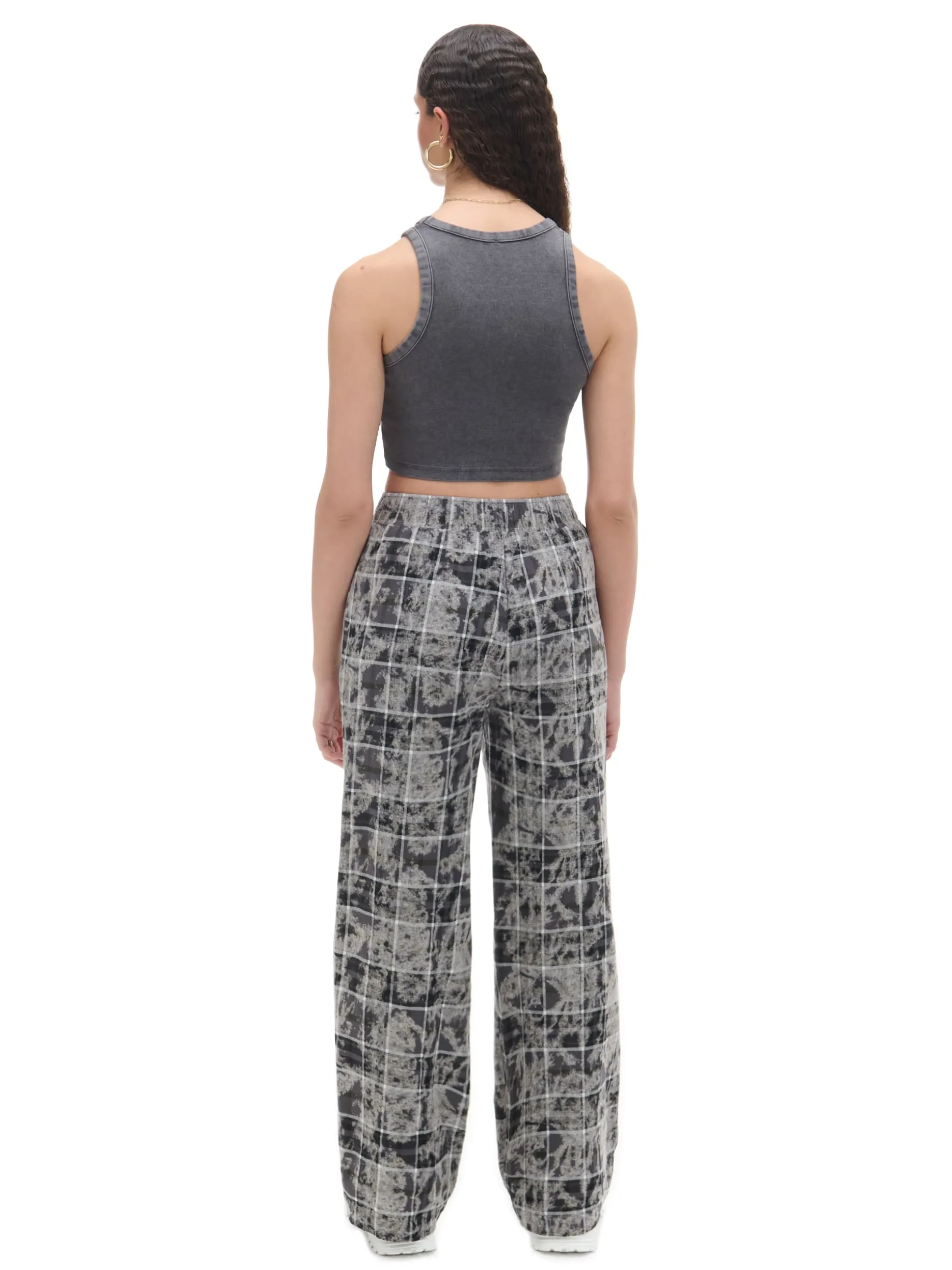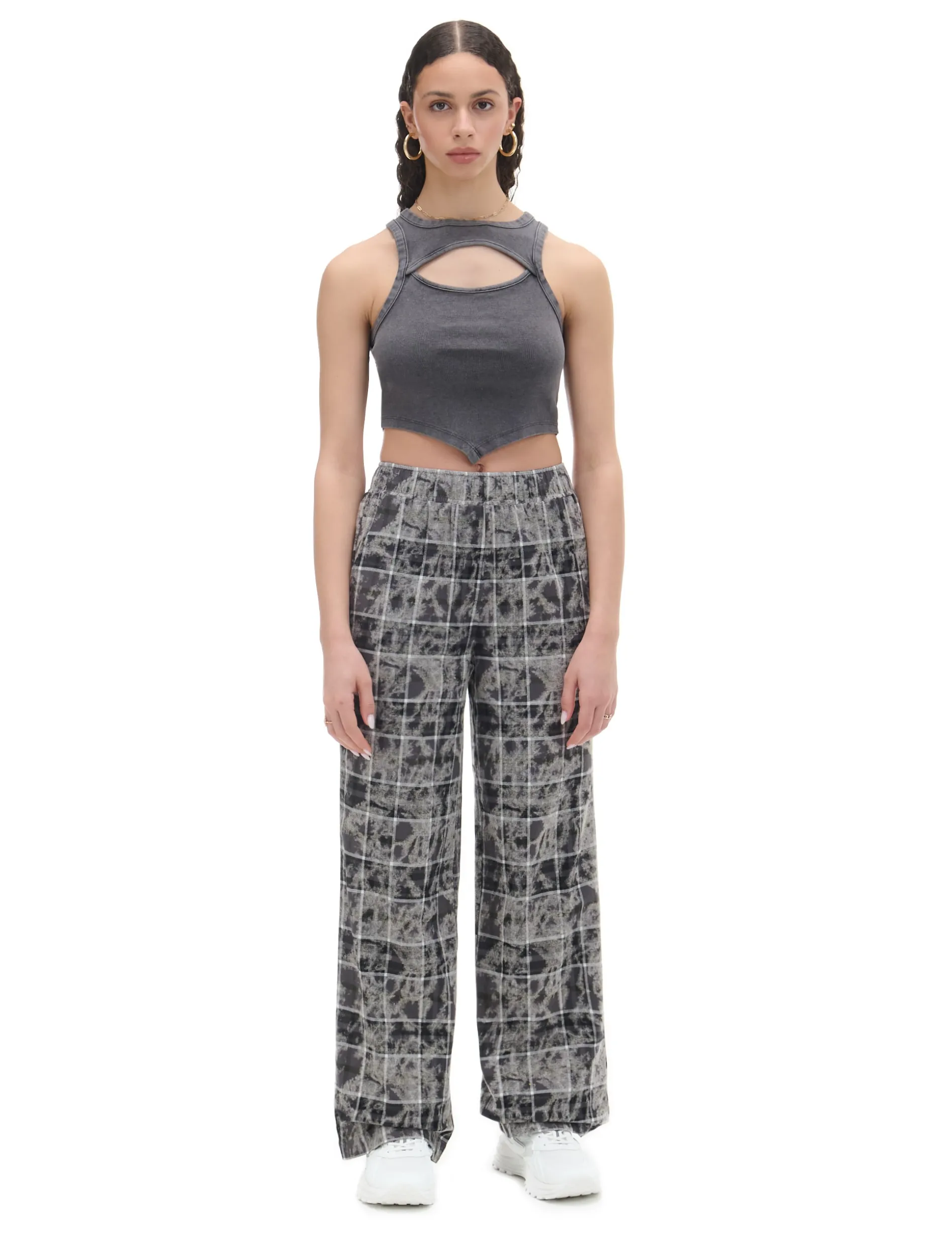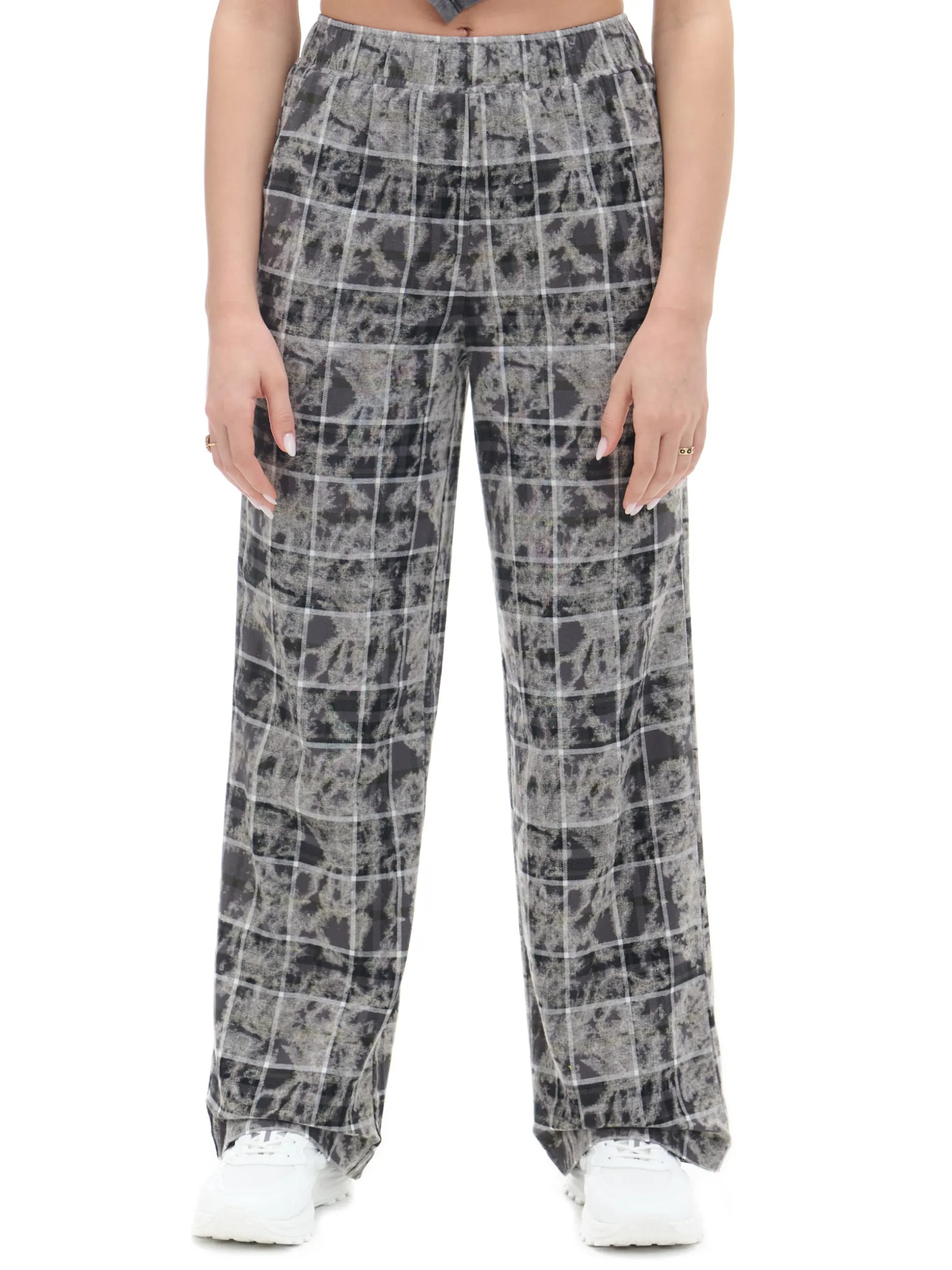 Damskie spodnie, uszyte z tkaniny o stuprocentowej zawartości bawełny. Idealna propozycja dla fanek nietypowych wzorów! średni stan w pasie elastyczna gumka dwie kieszenie imitacja rozporka na całości ciekawy nadruk w kratę Wzrost modelki: 170 cm