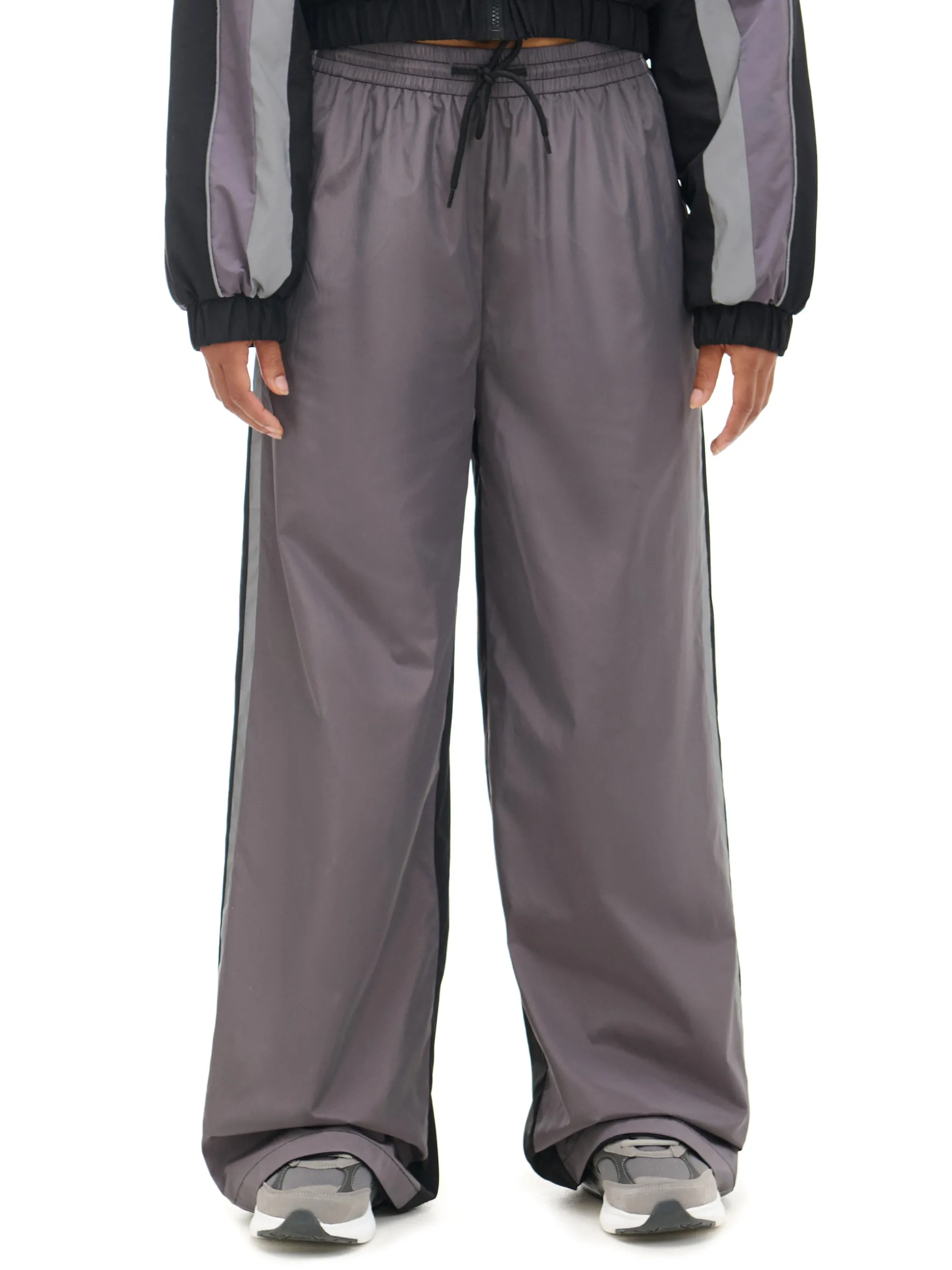 Damskie spodnie o kroju wide leg, wykonane z lekkiej i miłej w dotyku nylonowej tkaniny. Materiał odporny na gniecenia, wytrzymały i szybkoschnący. Idealny item do szkoły, na studia, czy pracy. regularny stan guma w pasie ze sznurkiem do regulacji długie, szerokie nogawki ozdobne biało-czarne lampasy Tworzy zestaw z modelem 177AR-99X .