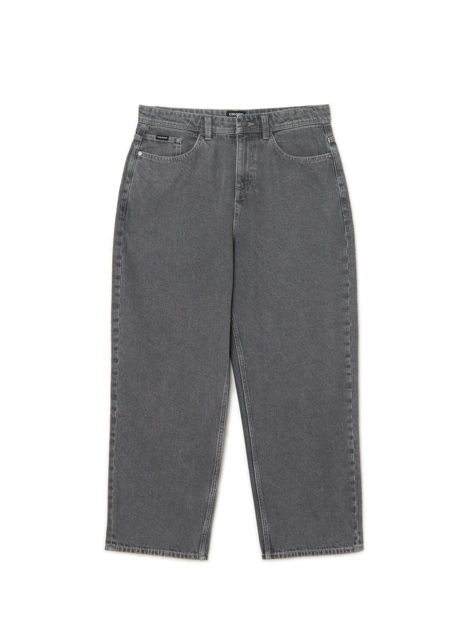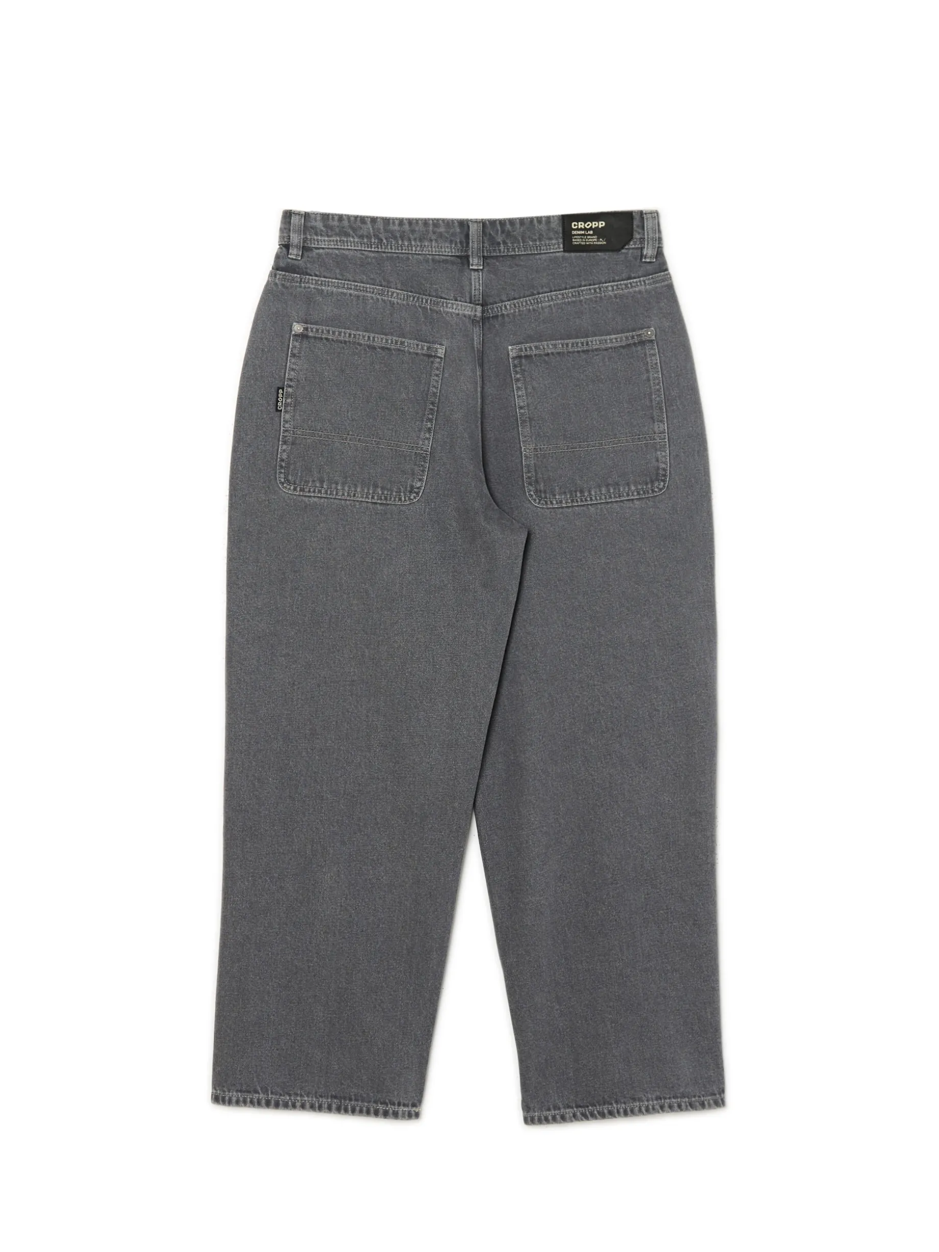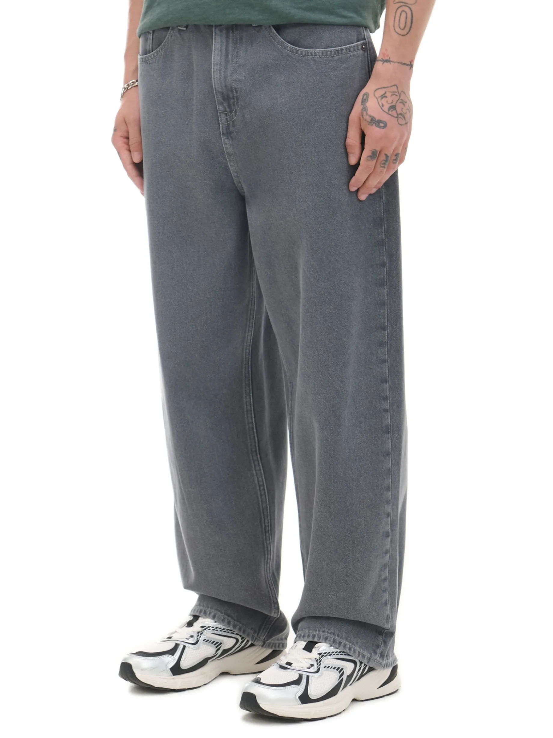 Męskie spodnie jeansowe o kroju super baggy, uszyte w 100% z bawełny. zapięcie na zamek i guzik długie, luźne nogawki cztery kieszenie szlufki na pasek efekt stone wash Model prezentuje produkt w rozmiarze M/L. Wzrost modela: 185 cm