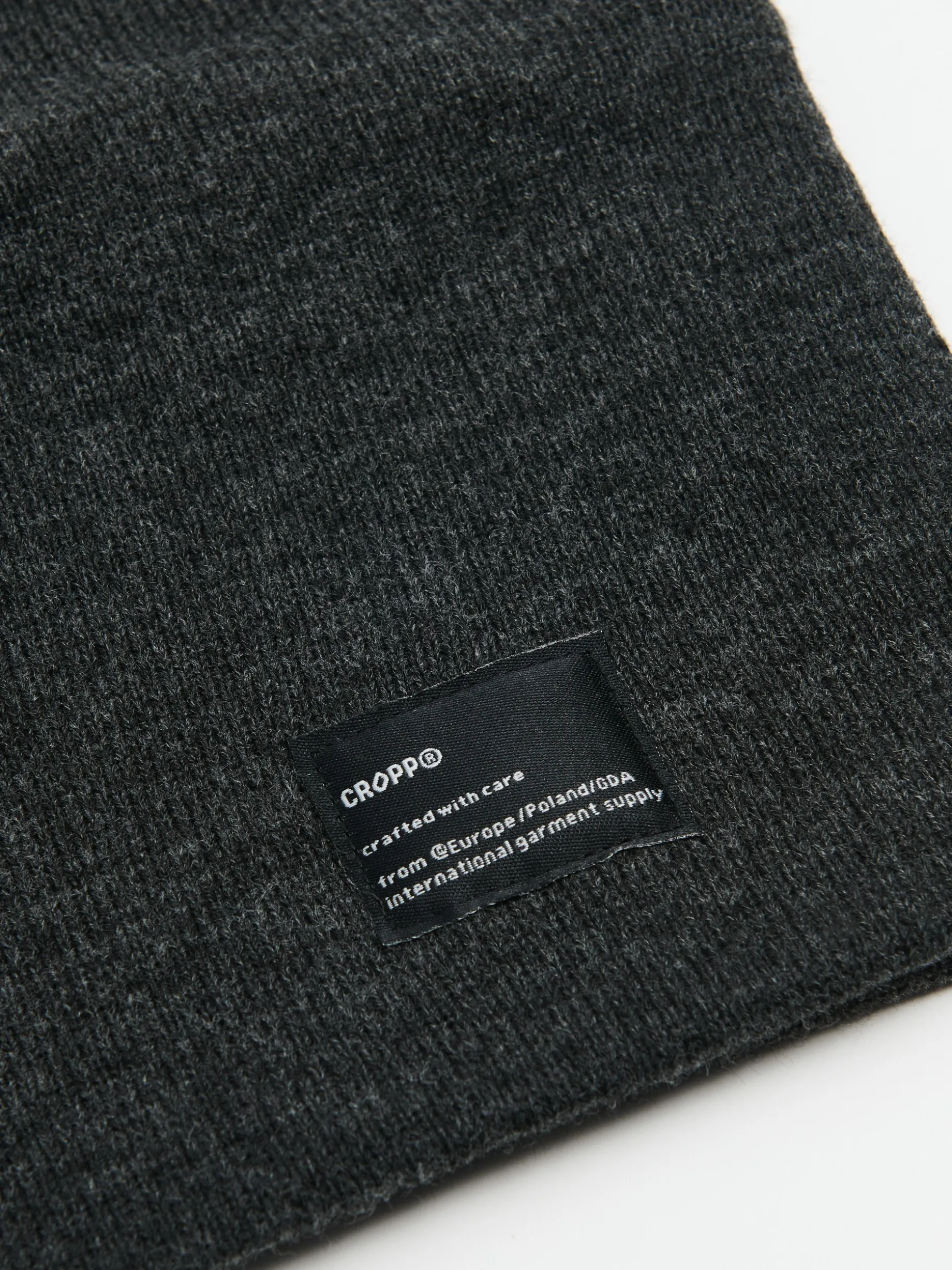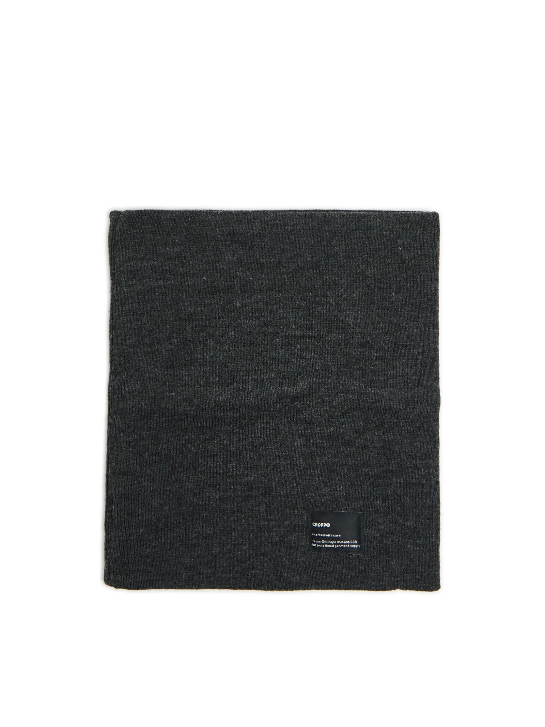 Wygodny męski komin typu basic, uszyty z dzianiny w kolorze szarym z brandową naszywką.