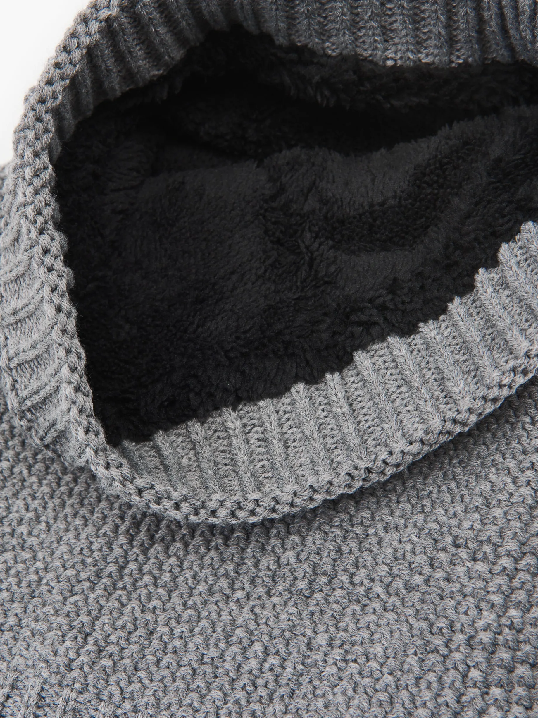Szary męski szalik typu komin, uszyty z grubej, mięsistej dzianiny o ciekawym splocie. U dołu ozdobiony niewielką metką z napisami. Praktyczne must-have na zimne miesiące!