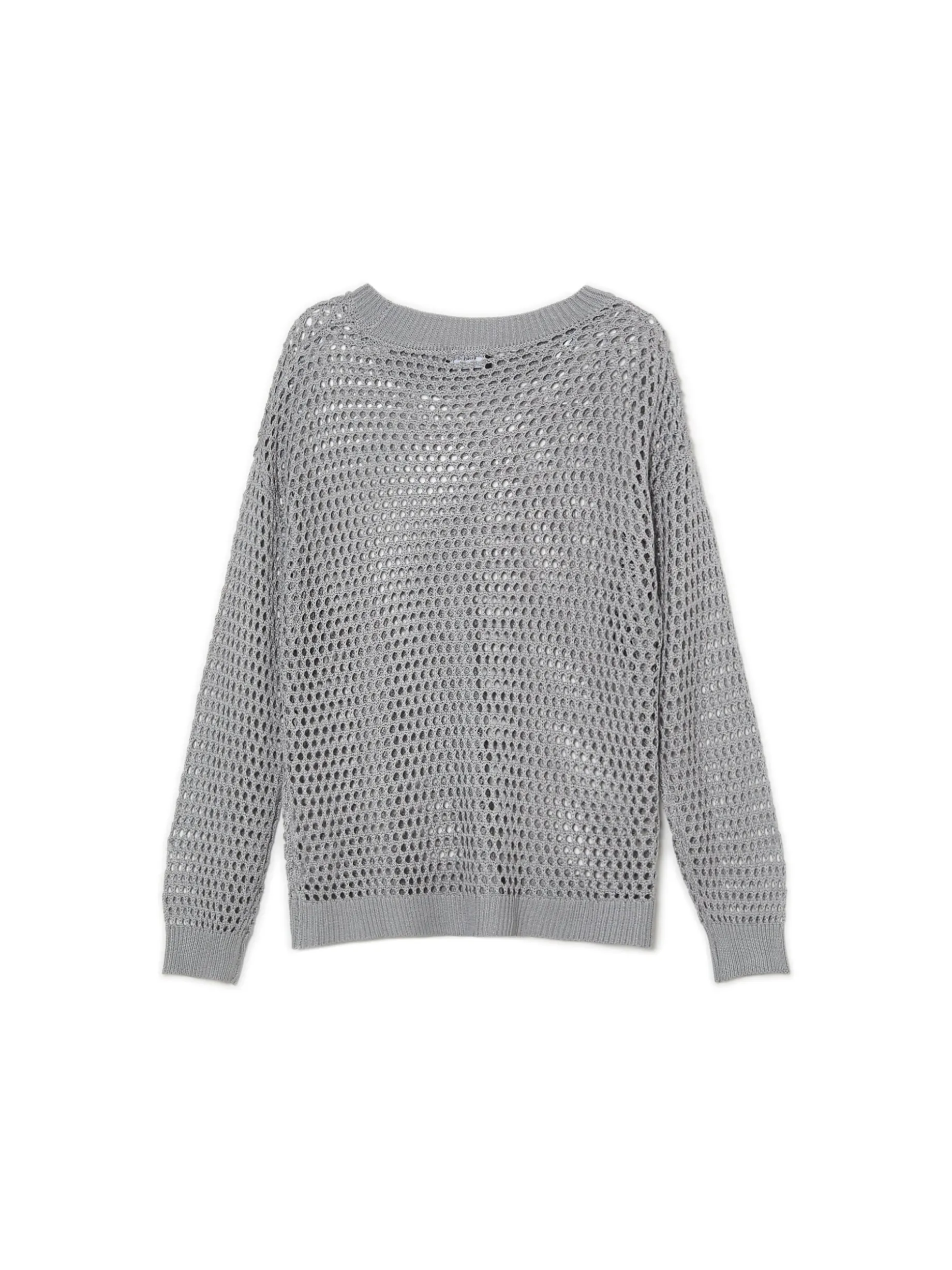 Damski szary sweter, uszyty z wiskozowej dzianiny. regularny krój długie rękawy splot o dużych oczkach Wzrost modelki: 177 cm