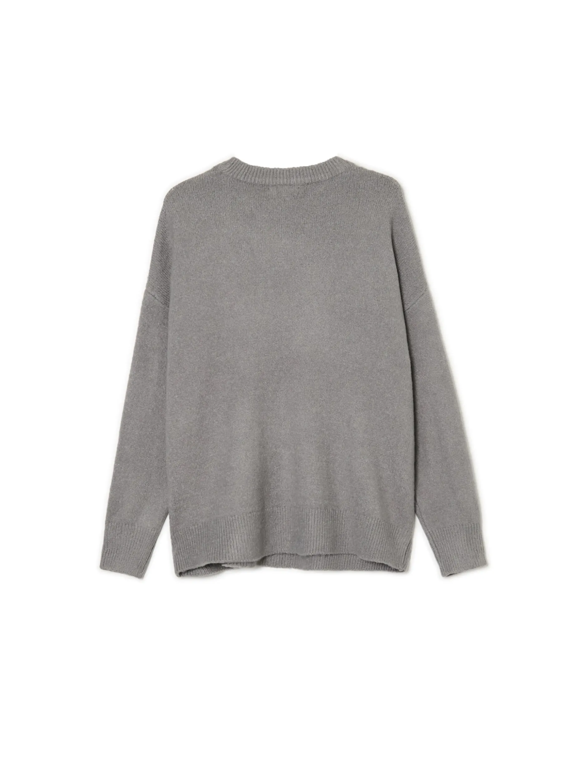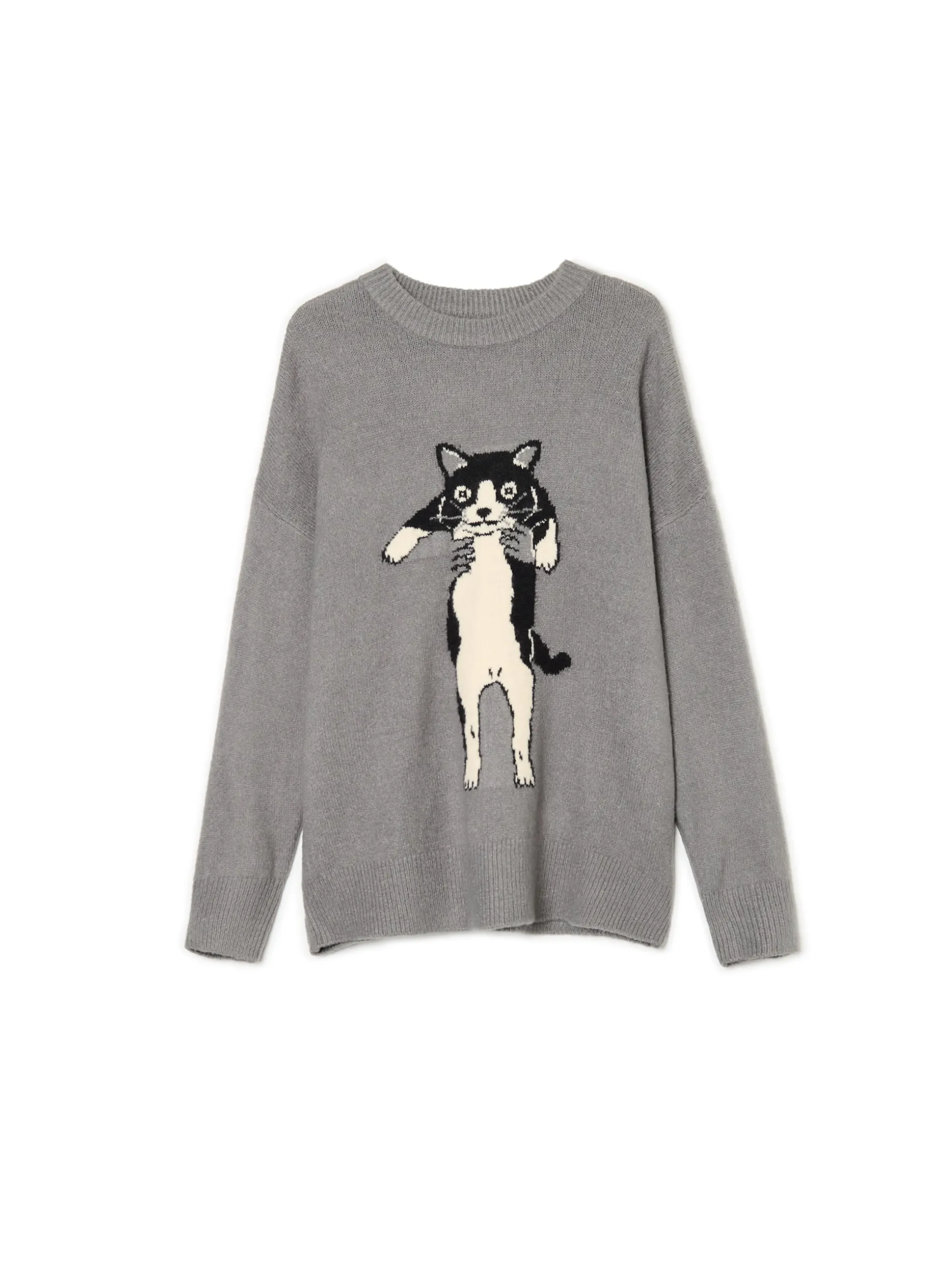 Kocyk, herbatka i ciepły sweter to idealny mix na jesień! Damski item uszyty z przyjemnej w dotyku dzianiny w szarym kolorze matchuje z tą wizją. Łap kotka i do koszyka! dzianina z domieszką elastycznych włókien regularny krój okrągły dekolt z lamówką długie rękawy z obniżoną linią ramion dół i rękawy wykończone prążkowanym ściągaczem z przodu grafika z kotem