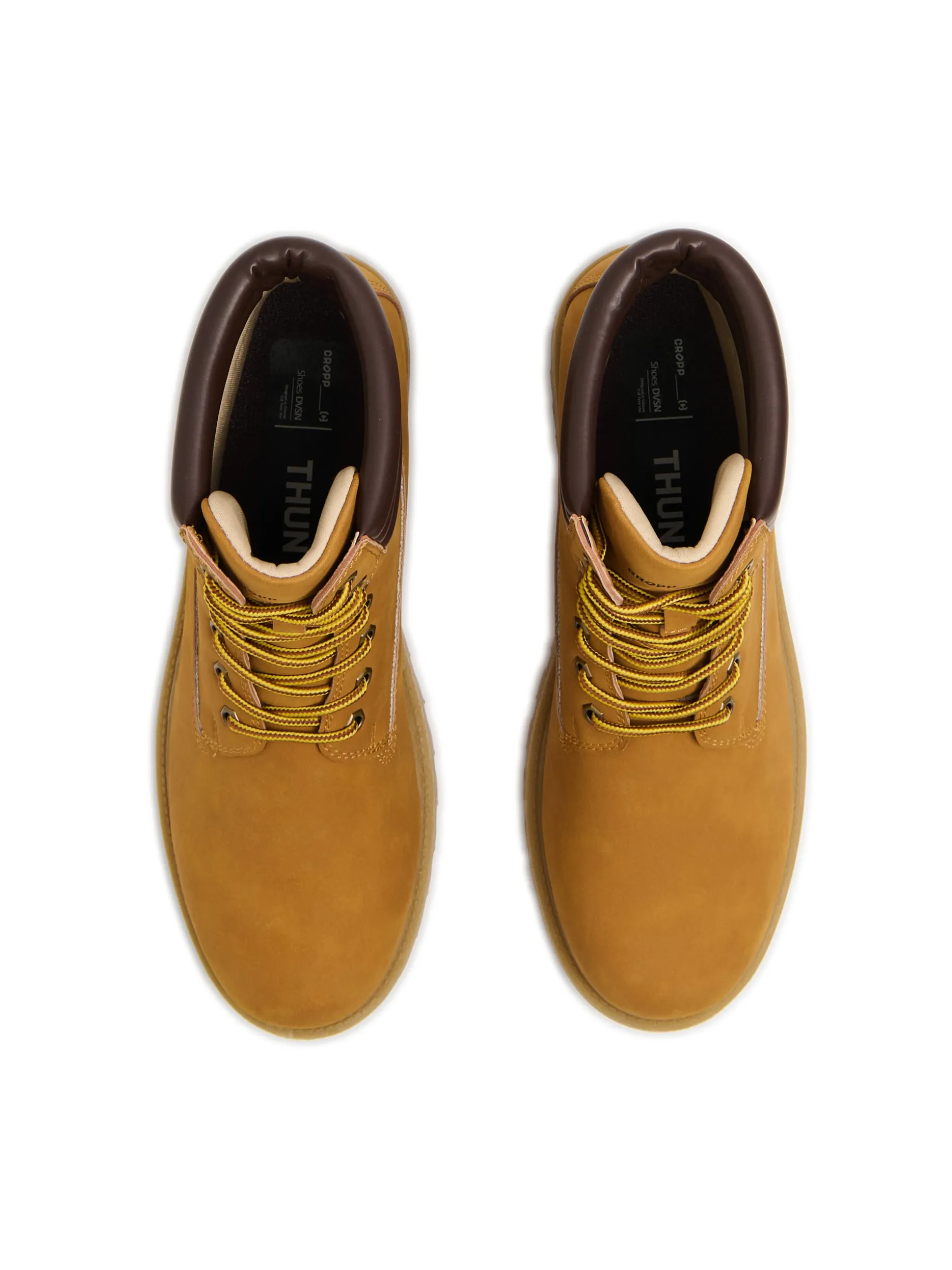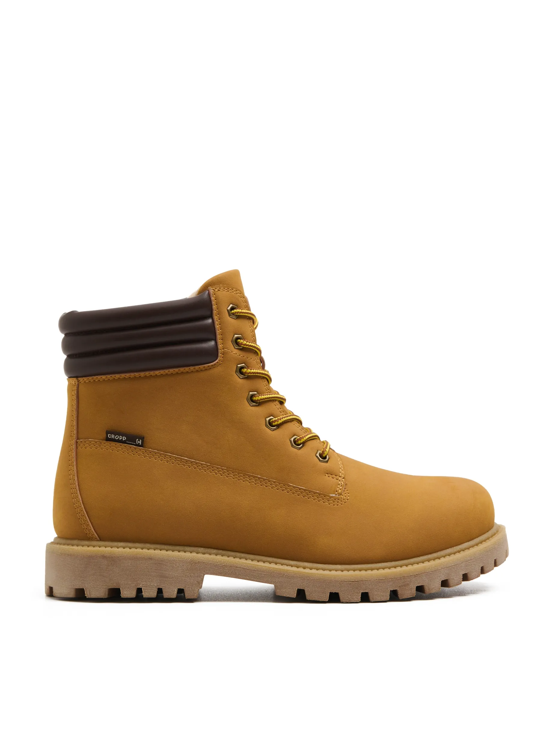 Winter is coming! Męskie buty trekkingowe typu worker wykonane ze sztucznej nubukowej skóry. Do tego kolorowe sznurówki, miękka wkładka i dekoracyjne przeszycia. Wejdź w zimowy vibe z naszymi butami! botki za kostkę cholewka z imitacji skóry lekkie gąbkowanie wokół kostki wiązane na sznurówki metalowe przelotki zapobiegające uszkodzeniu materiału traperowa podeszwa wykonana z gumy termoplastycznej naszywka Cropp