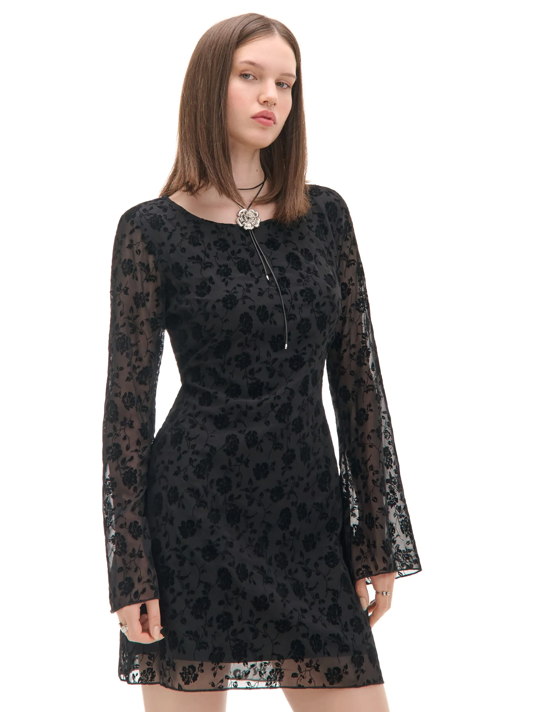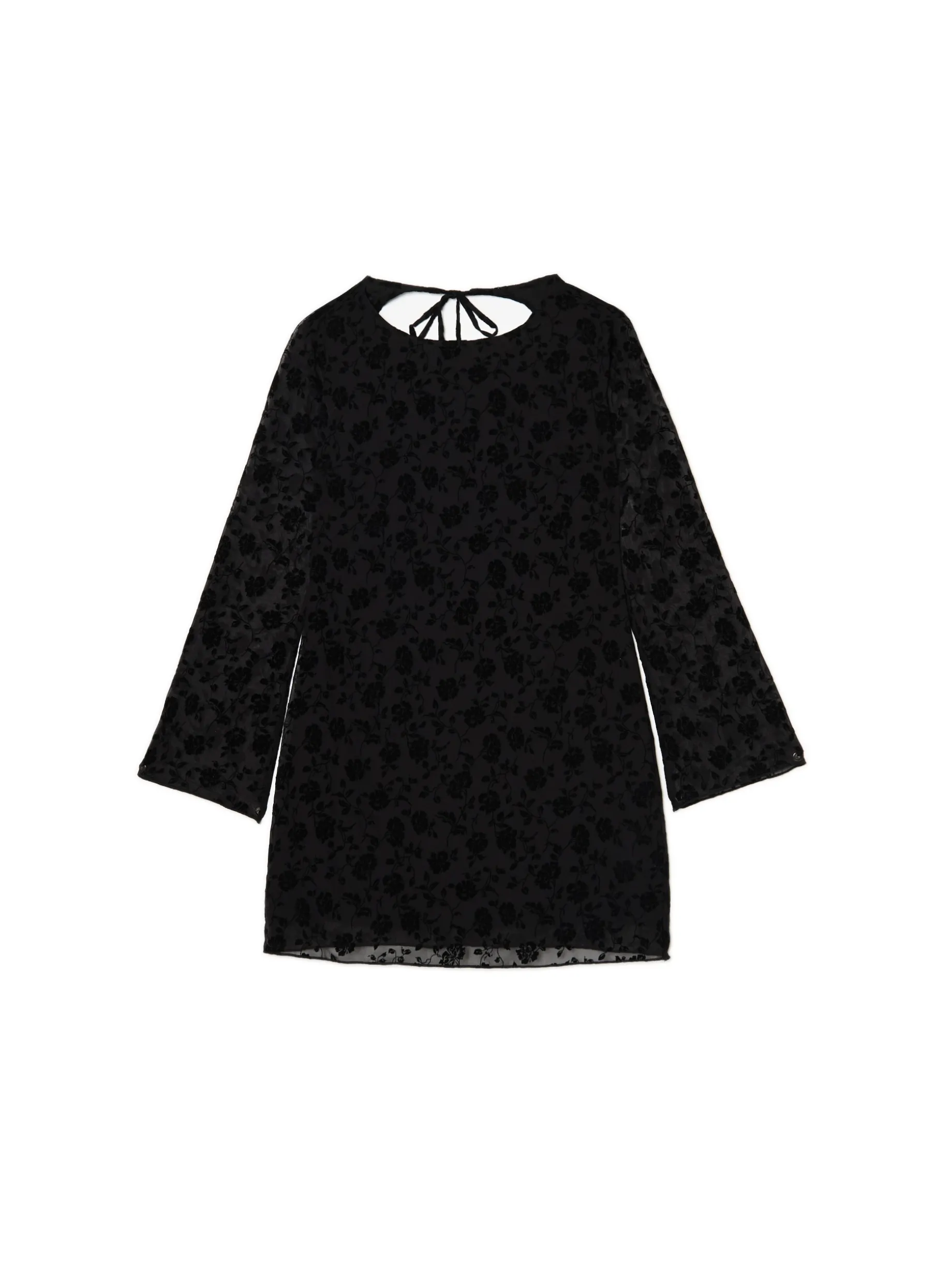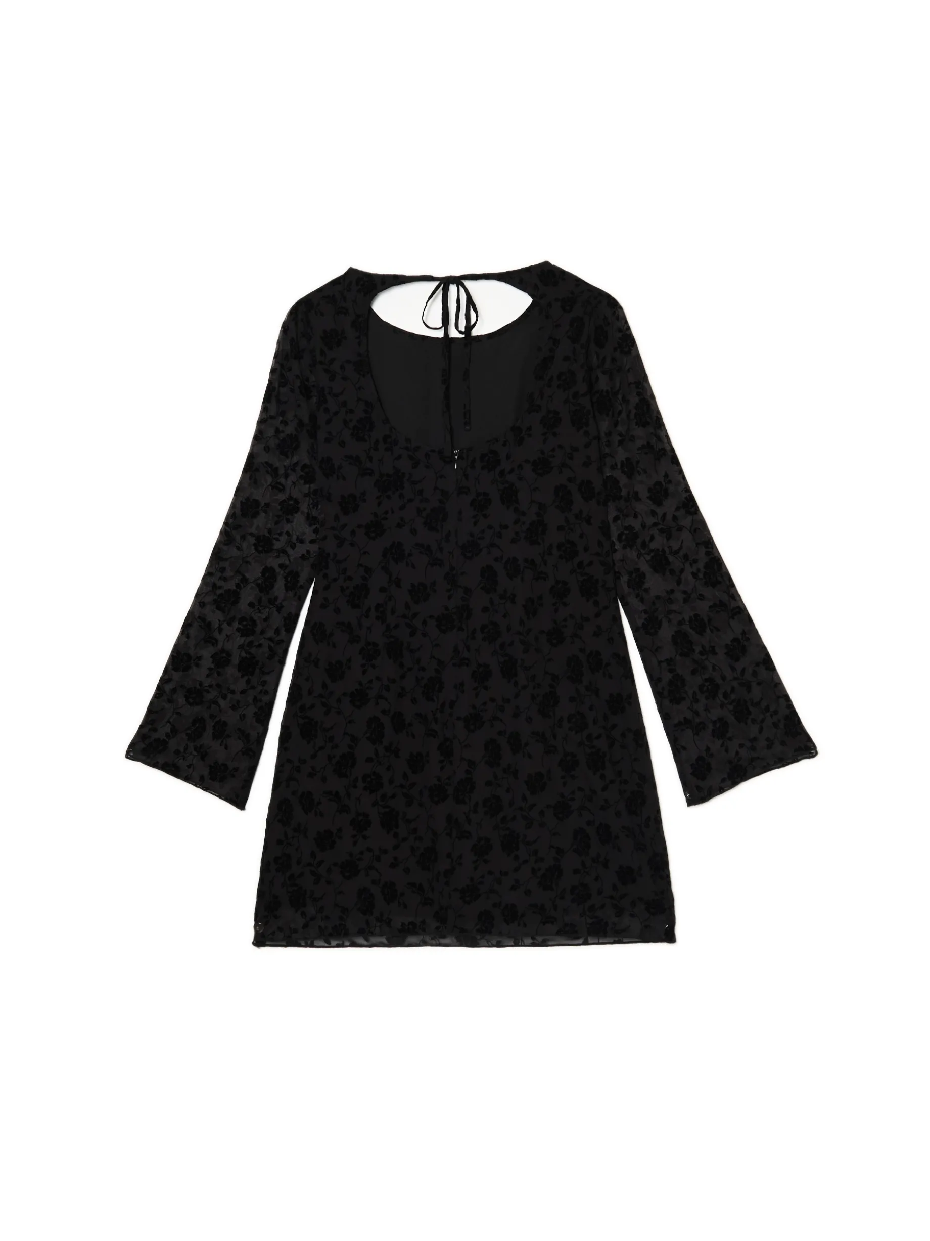 Wzorzysta sukienka o długości mini wykonana z prześwitującego szyfonu z kwiatowym wzorem. Idealna na spontaniczne wyjścia z przyjaciółmi! uszyta z szyfonowej tkaniny w kwiatowy wzór długość mini wewnątrz gładka podszewka zapięcie na kryty zamek z tyłu ozdobne wiązanie na plecach półokrągły dekolt z lamówką efektowne, odkryte plecy lekko rozszerzane rękawy kwiatowy wzór Wzrost modelki: 172 cm