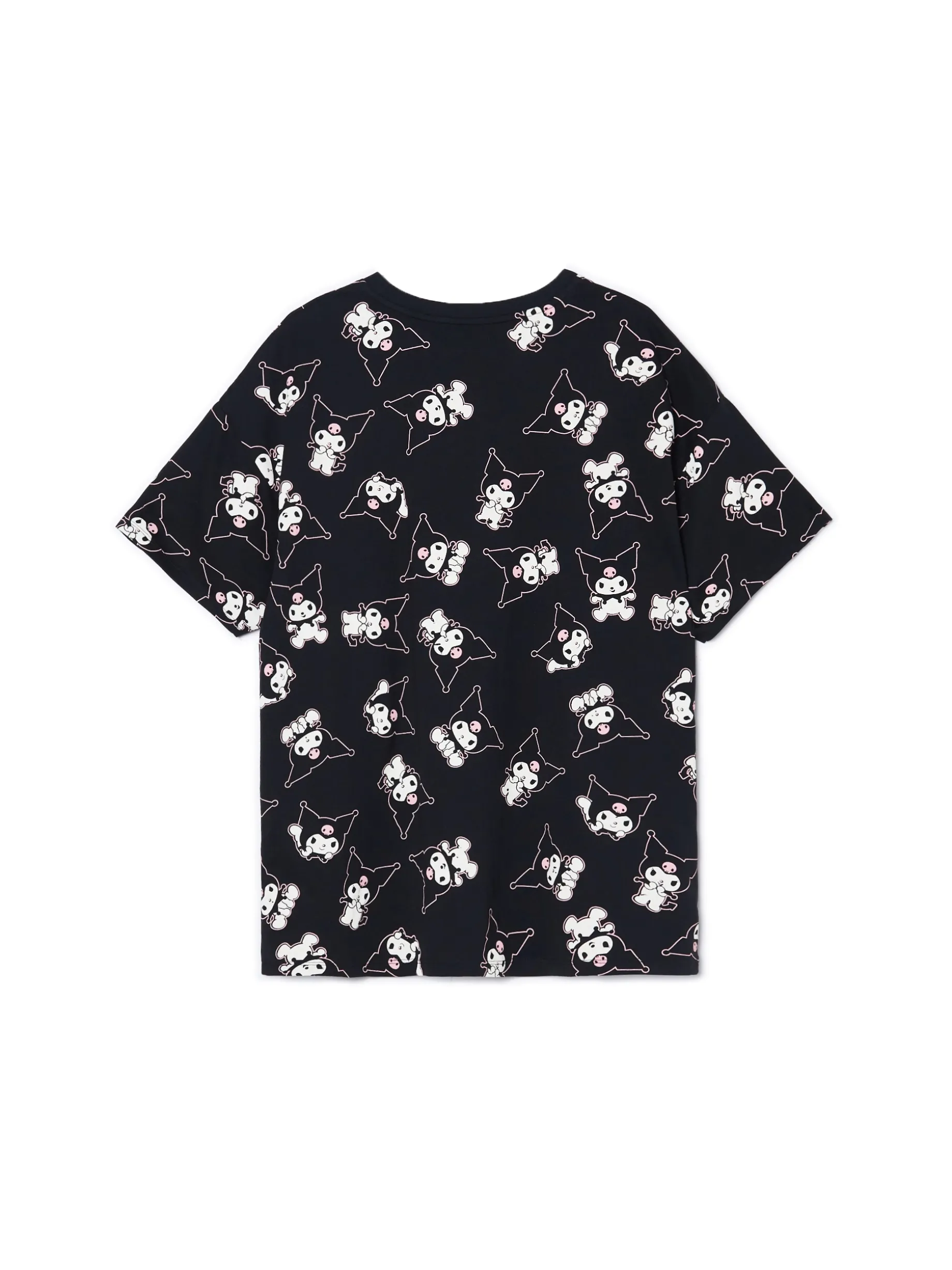 Czarna damska koszulka, uszyta w 100% bawełny. fason oversize krótkie rękawy nadruk z motywem Kuromi all over z przodu błyszczący różowy napis Wzrost modelki: 172 cm © 2024 SANRIO CO., LTD.
