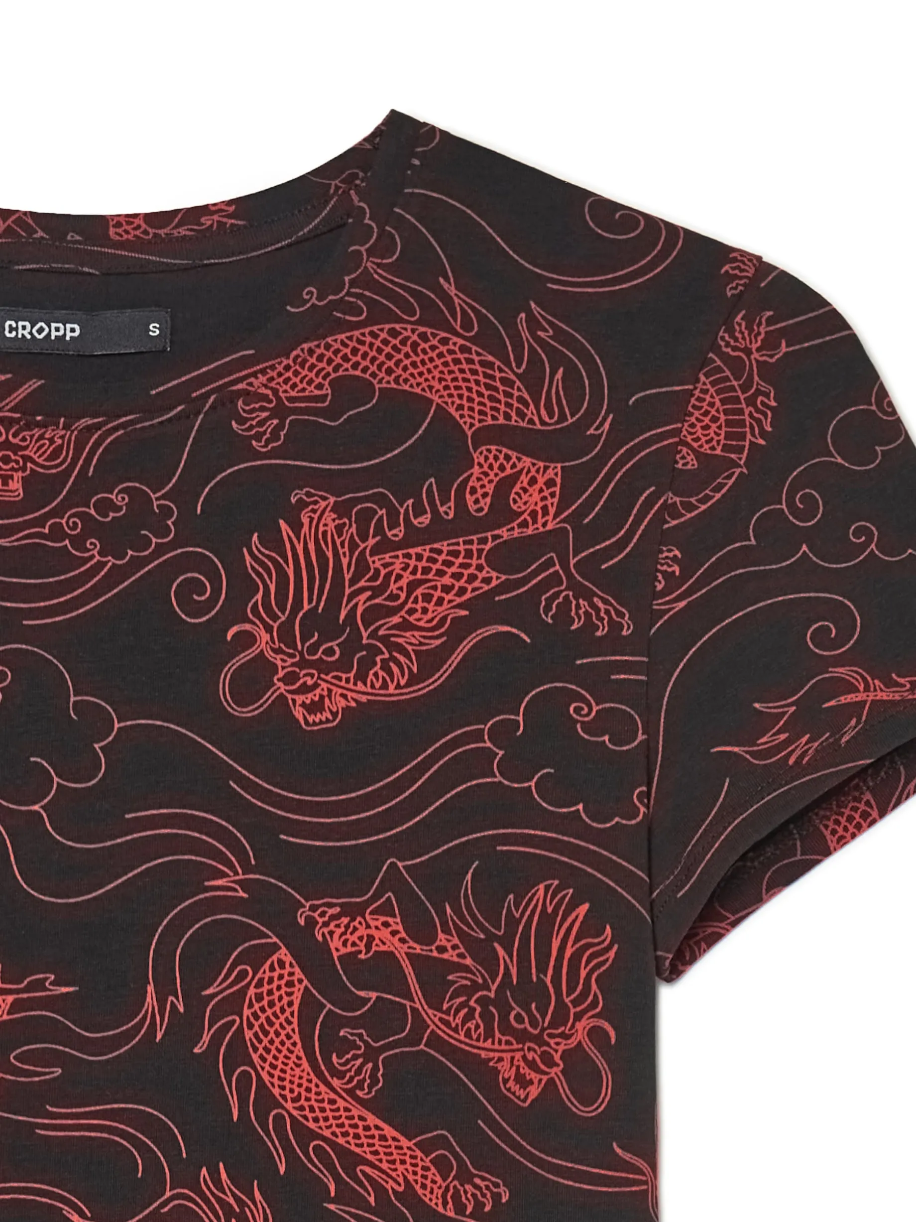 Czarny t-shirt damski o krótszym, dopasowanym kroju. Uszyty z elastycznej bawełny. Na całości nadruk z motywem smoków. Modelka prezentuje produkt w rozmiarze S/36. Wzrost modelki: 173 cm
