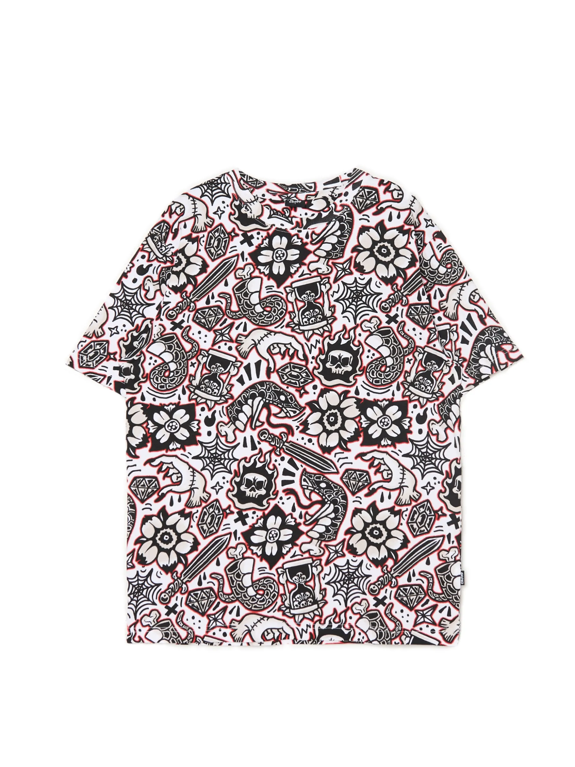 Bawełniana męska koszulka z krótkim rękawem i unikatowym nadrukiem na całej powierzchni w kolorze czarnym i czerwonym. 100% bawełny regularny krój okrągły dekolt z lamówką krótkie, swobodne rękawy nowoczesny nadruk all over