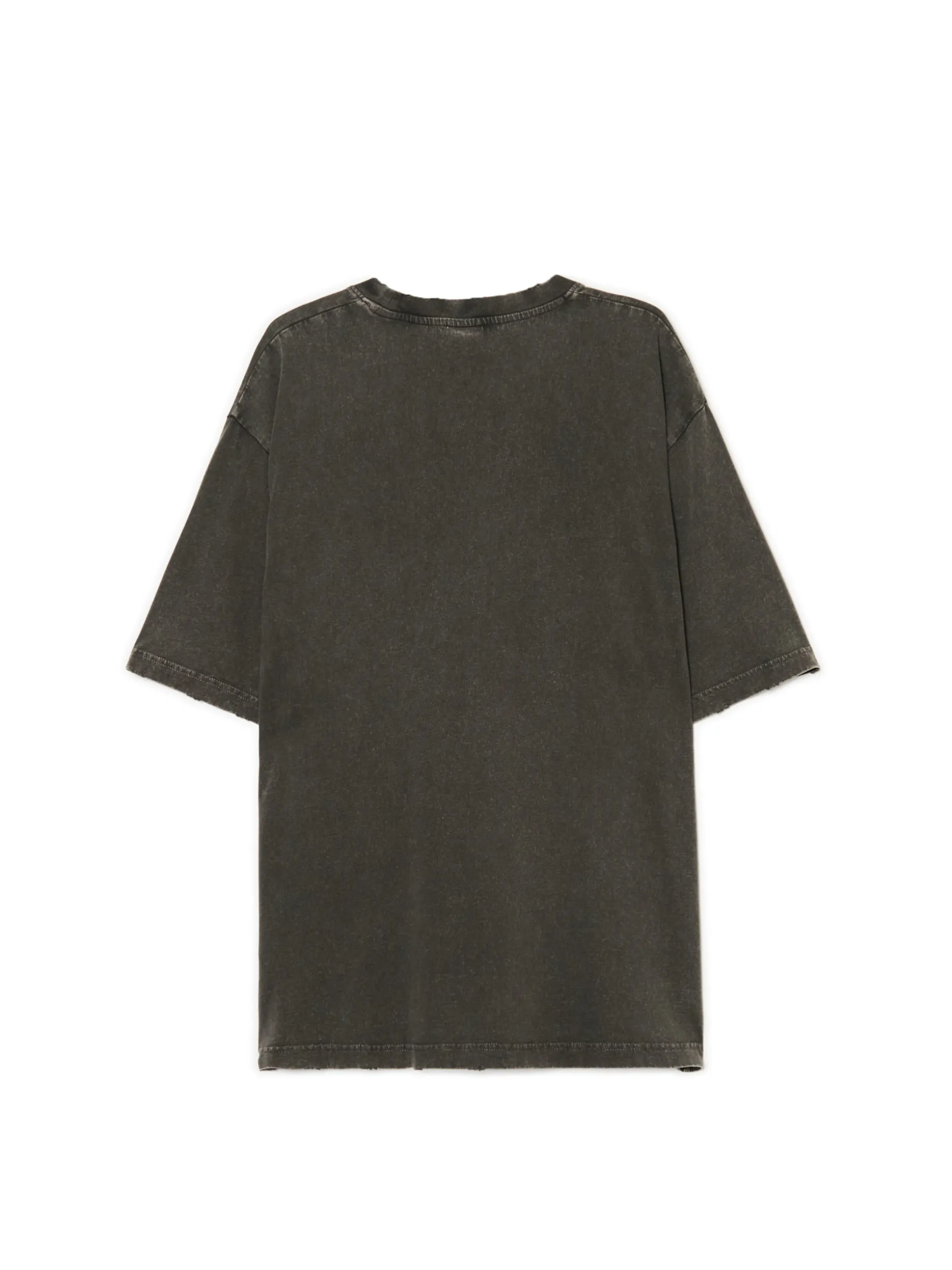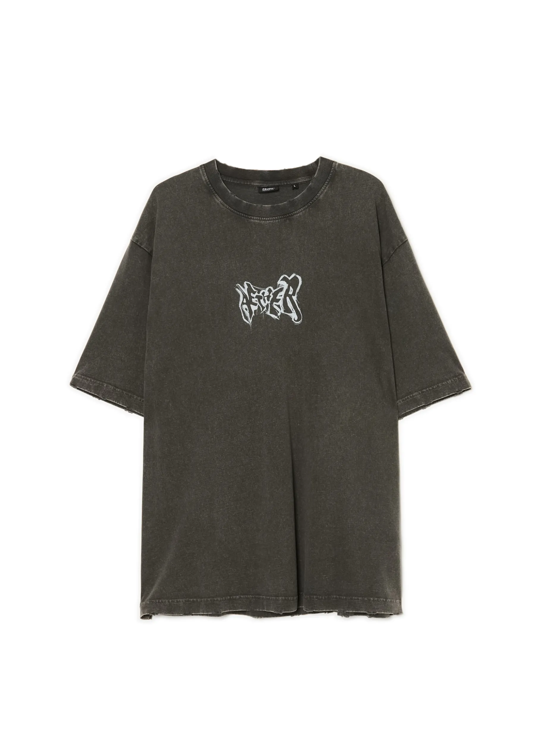 Ciemnoszara koszulka męska z krótkim rękawem uszyta z bawełnianej dzianiny. Ozdobą tego modelu są surowo wykończone brzegi materiału, efekt sprania na całej powierzchni i nadruk na piersi. 100% bawełny wygodny krój comfort krótkie, swobodne rękawy surowe wykończenie brzegów efekt sprania na całości nadruk z przodu Wzrost modela: 185 cm