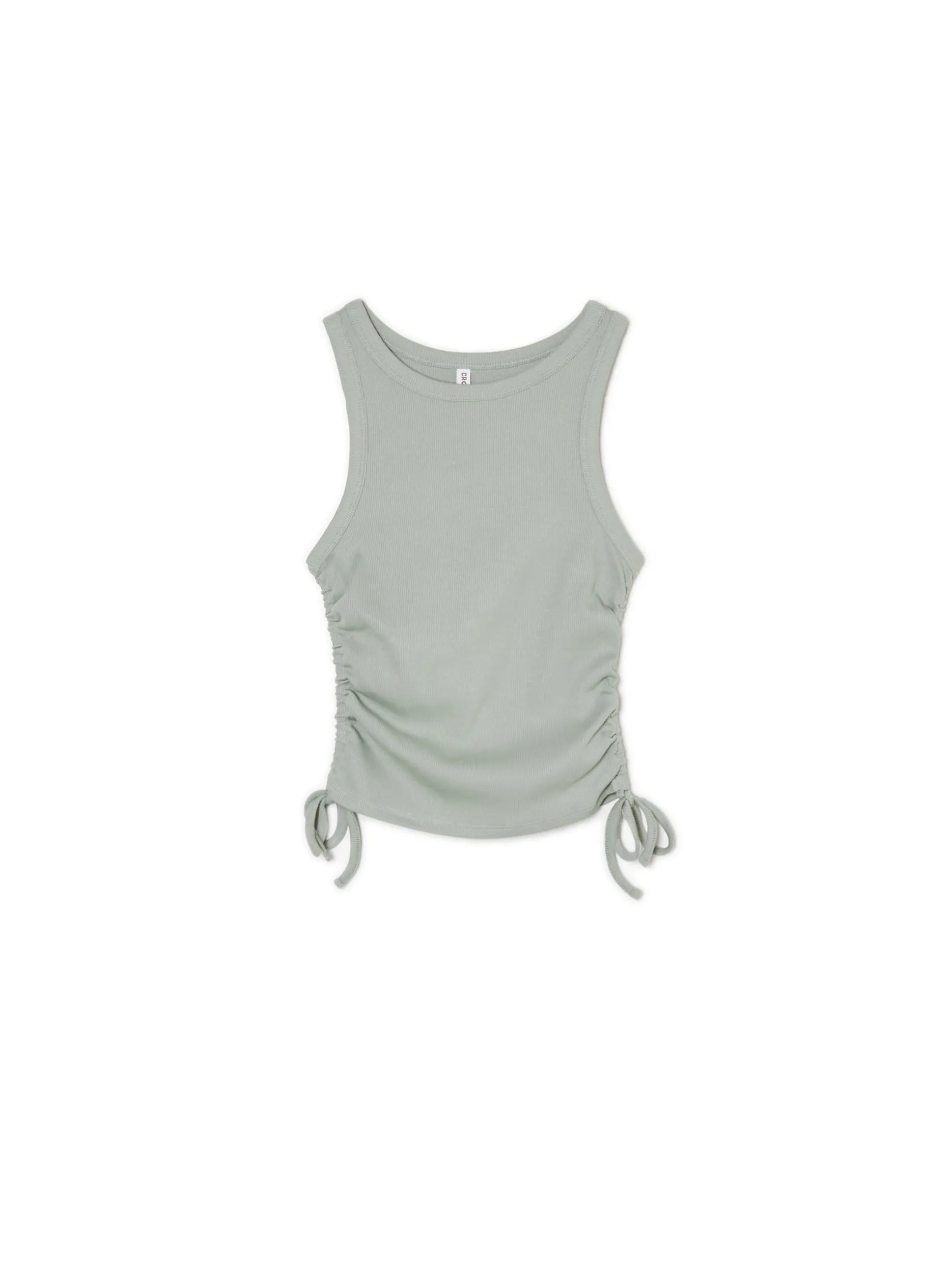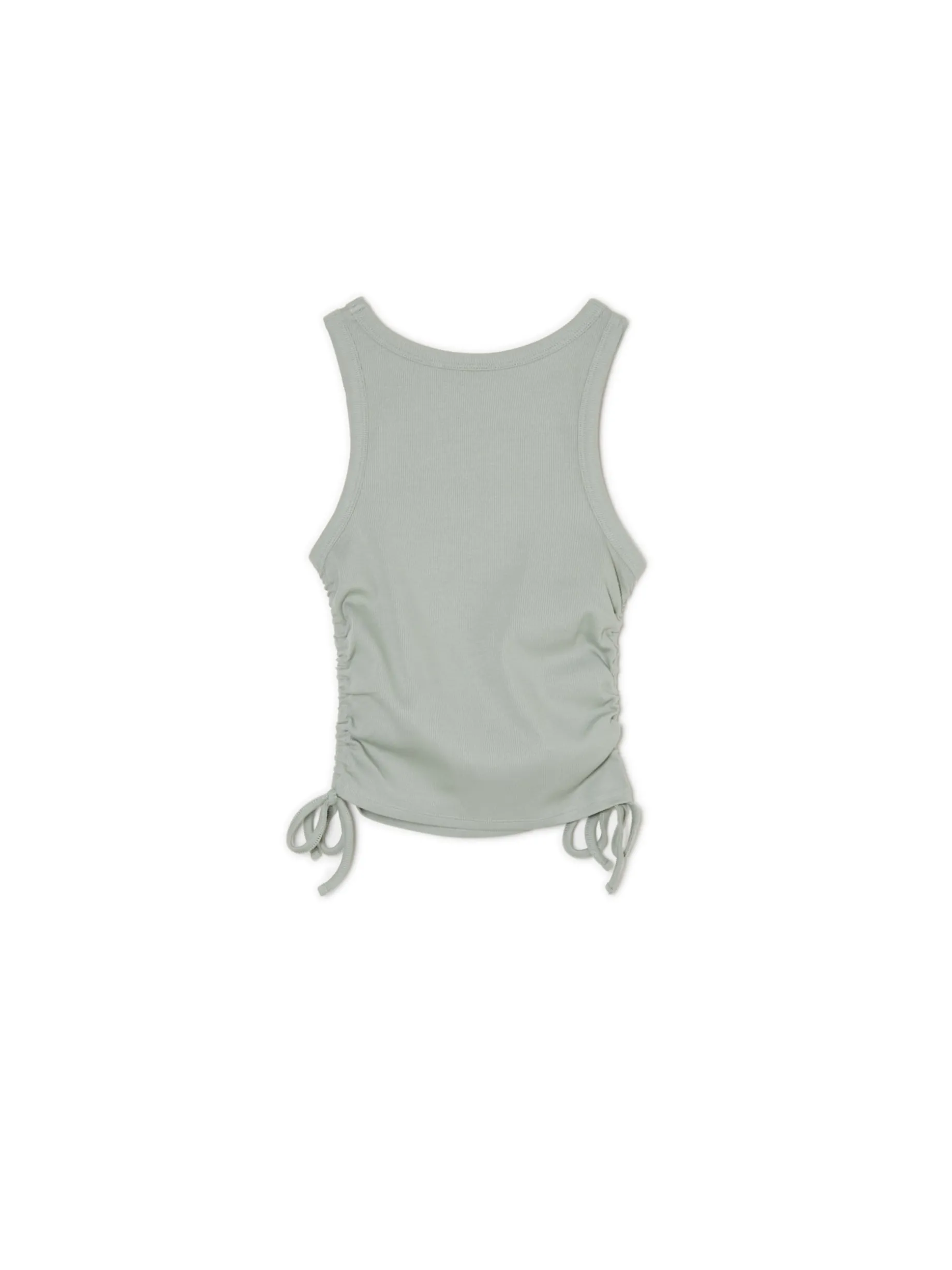 Zielony damski top, uszyty z dzianiny o wysokiej zawartości bawełny. mocno dopasowanu krój dekolt typu halterneck grube ramiączka po bokach marszczenia i wiązania Wzrost modelki: 170 cm
