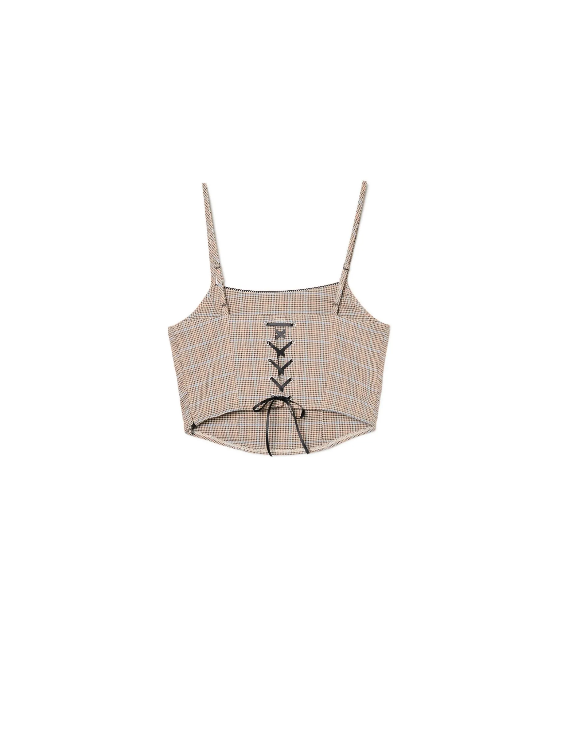 Krótki top damski o dopasowanym kroju, uszyty z grubej, mocnej tkaniny typu twill. ze wzorem w kratę. Dekoracyjne wykończenie przy dekolcie i wiązanie na plecach zwracają na siebie uwagę. dopasowany krój zapięcie na kryty zamek z boku kwadratowy dekolt z przodu i z tyłu wąskie ramiączka z regulacją długości ozdobne wiązanie na plecach dekoracyjne wykończenie brzegów wzór w drobną kratę na całości Tworzy zestaw z modelem 388AR-88M .