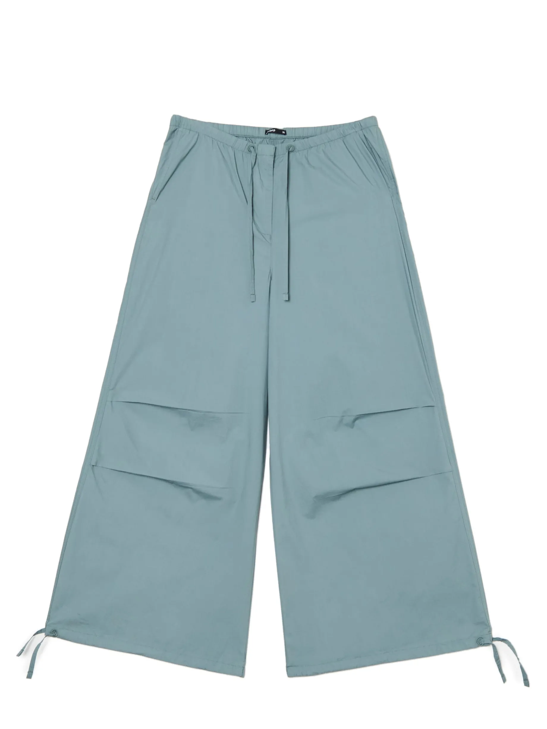 Szerokie damskie spodnie, uszyte w 100% z bawełny. w pasie sznurek do regulacji rozporek i zapięcie szeroka nogawka, zakończona wiązaniem z troczkami cztery kieszenie Wzrost modelki: 177 cm