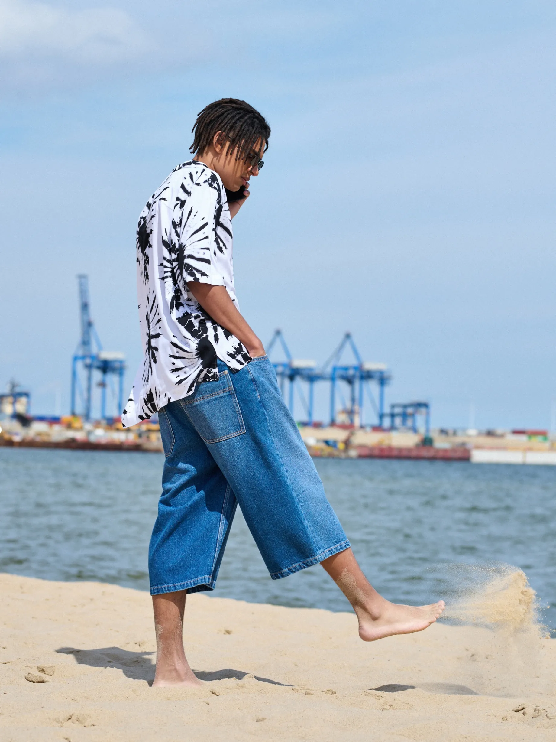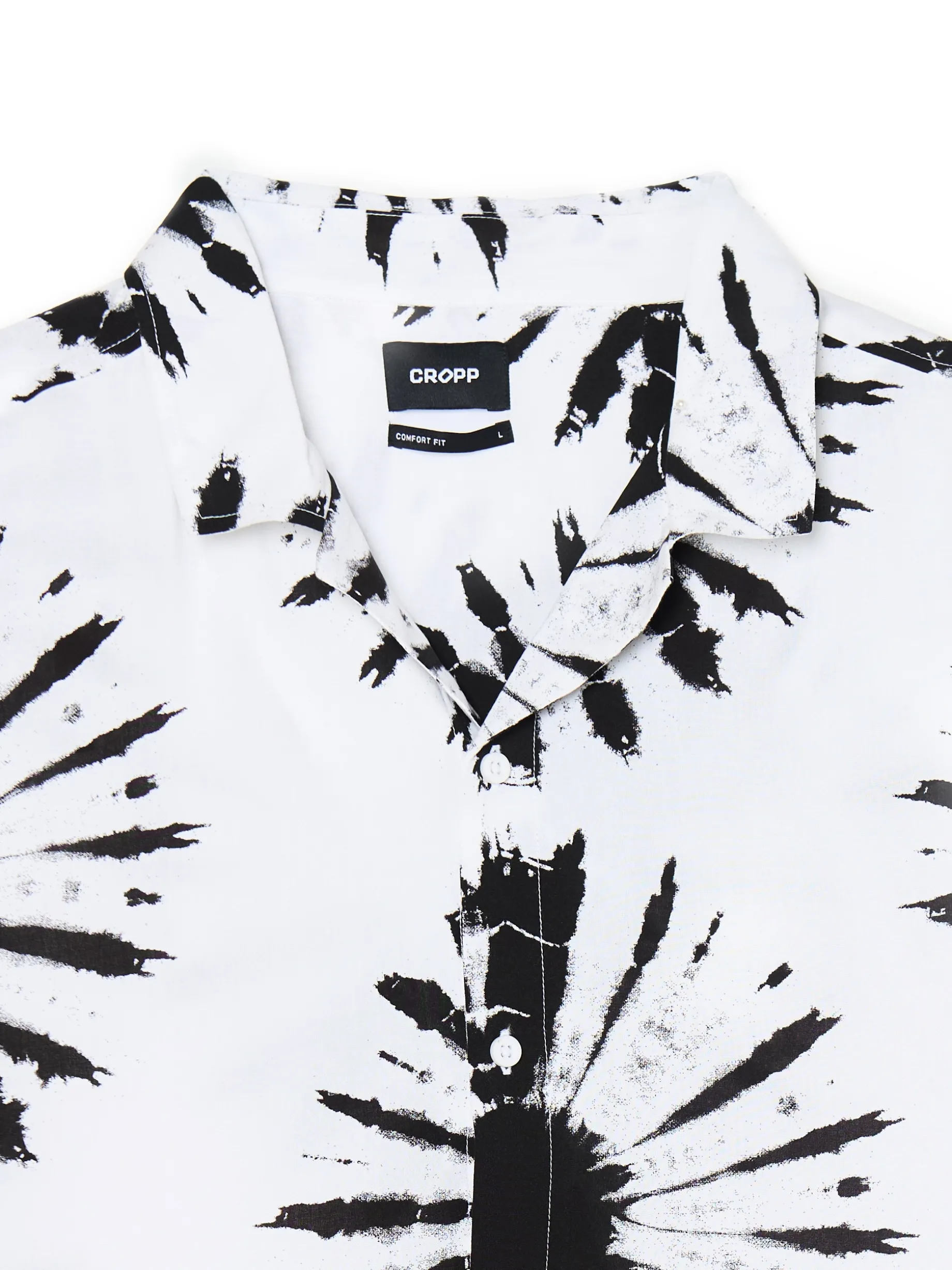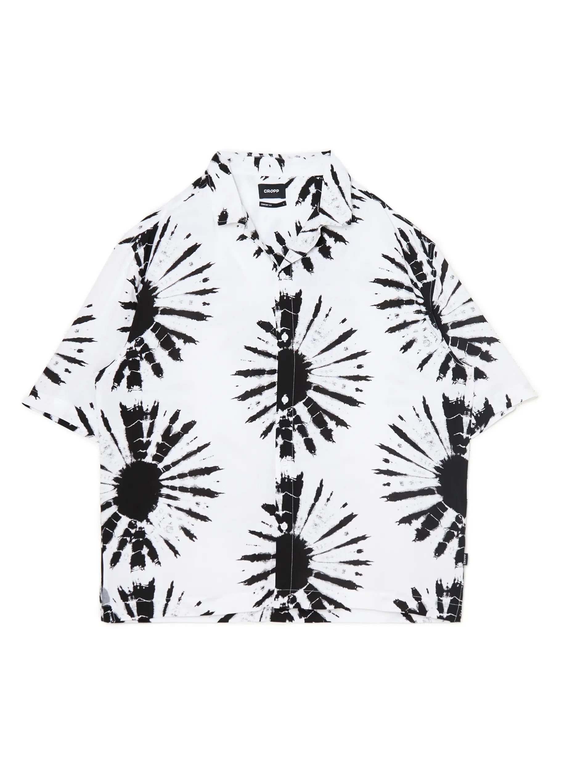 Lekka biało-czarna męska koszula, uszyta w 100% z wiskozy. Idealna na lato! lekki materiał z wiskozą wygodny fason comfort krótkie rękawy kubański kołnierzyk nadruk all over