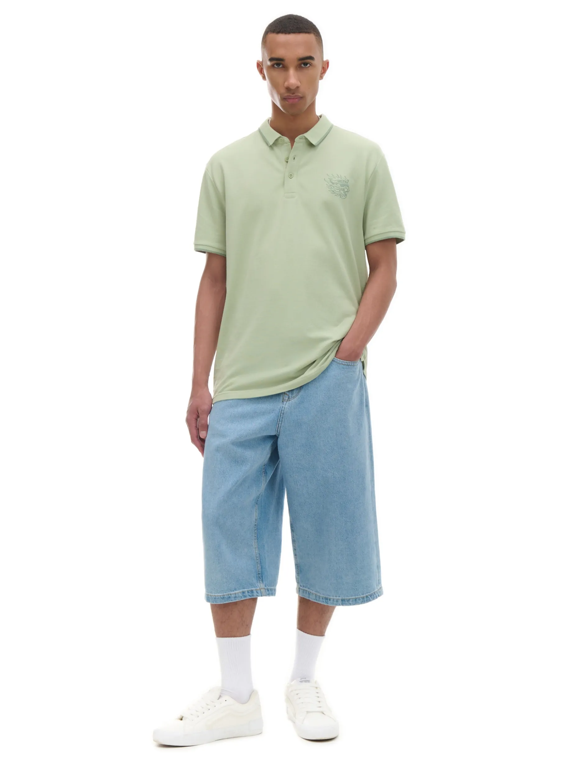 Jasnozielona męska koszulka polo, uszyta w 100% z bawełny. Dowód na to, że mix streetwearu i old money wygląda genialnie! regularny krój kołnierzyk polo i guziki krótkie rękawy z ciekawym wykończeniem na piersi haft z motywem tygrysa Wzrost modela: 185 cm