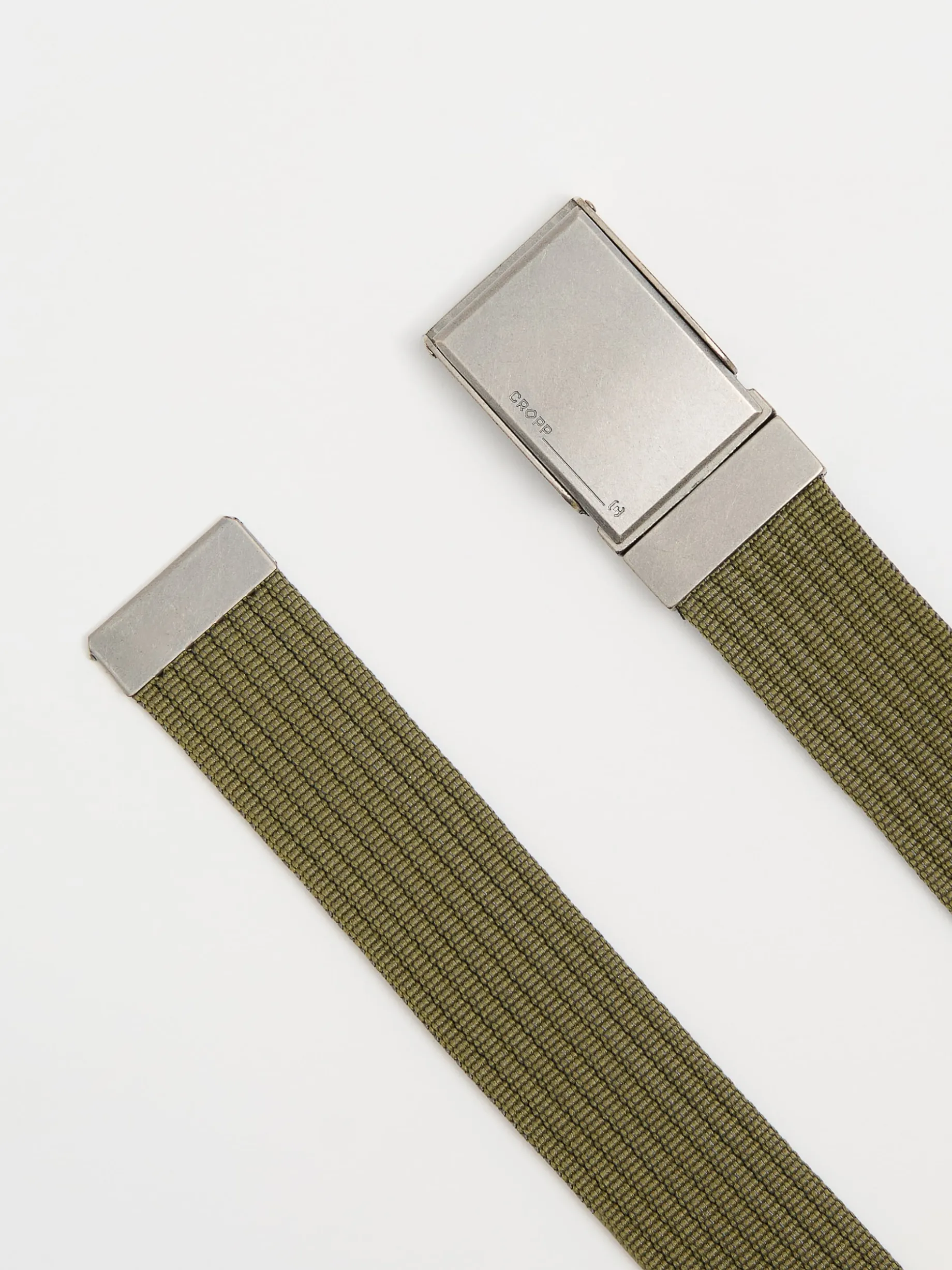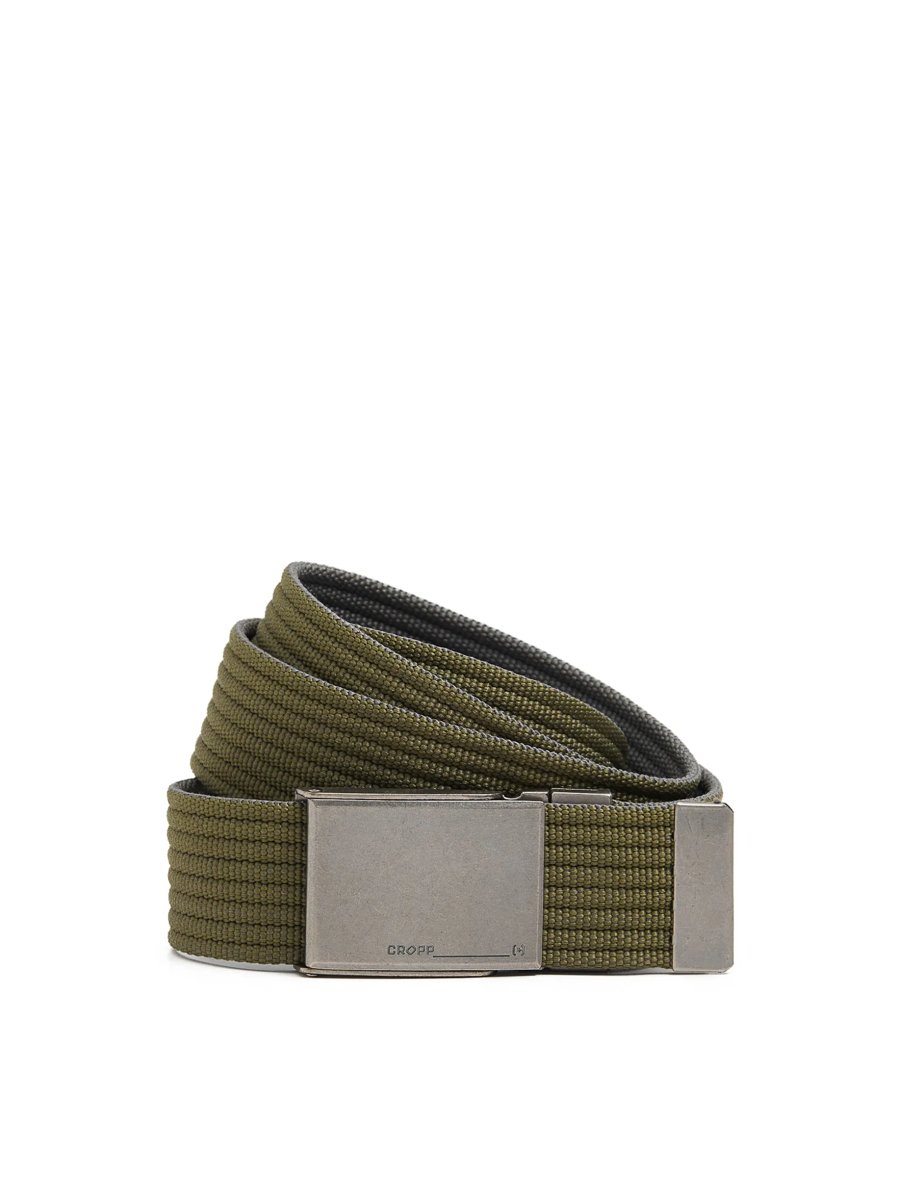 Męski parciany pasek do spodni wykonany z grubej, trwałej tkaniny w ciemnozielonym kolorze. Wyposażony w wygodne zapięcie z klamrą z brandowym wykończeniem.